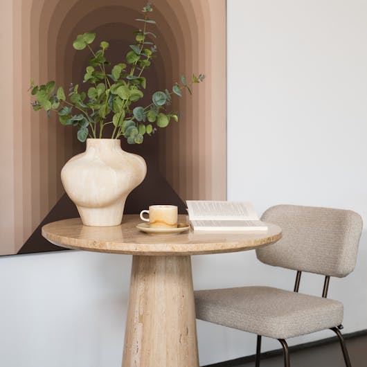 Een eettafel met een travertin blad is dé blikvanger in een moderne woonruimte. Combineer met eetkamerstoelen in glanzend lakwerk of subtiel velours en laat warme kleuren als beige, crème en brons de ruimte omarmen.