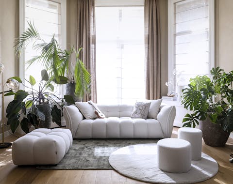 Heb je ruimte voor een royale eettafel? Combineer deze dan met een XXL eetkamerbank. Plaats de bank vrij in de ruimte voor een ruimtelijk effect, of zet hem met de rechte rug strak tegen de wand voor een compacte indeling. Door de hele eetset inclusief stoelen richting de wand te schuiven, creëer je extra loopruimte rondom de tafel. Maak je geen zorgen over vlekken op de lichte stof: met de All in House service geniet je van 7 jaar garantie op onder andere vlekbescherming. Zo kun je nog meer ontspannen tijdens het tafelen.
