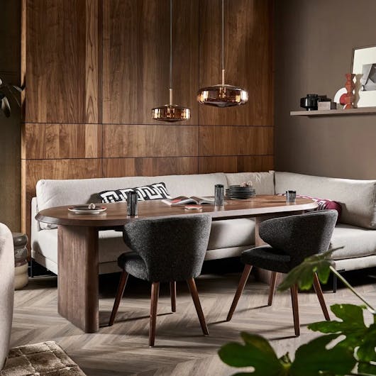 Denk eens buiten de gebaande paden en ga voor een complete eetwand in je interieur, zoals te zien in vtwonen Stijl Studio Industrieel! De eetkamerbank past perfect tussen de vakkenkast, een ruimte besparende keuze met lekker veel opbergruimte. De gestoffeerde panelen in een mooie warme aubergine kleur met stoere leren banden zorgen voor het echte industriële gevoel in de eethoek en zijn tegelijkertijd goed voor de akoestiek! Ook zie je dat je een ovale tafel goed kunt combineren met een rechte eetbank, en kun je aan de kopse kanten van de tafel ook een stoel of krukje kwijt.