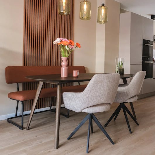 Een eetkamerbank met een ronde hoek brengt zachtheid en speelsheid in je eethoek. De vloeiende lijnen sluiten naadloos aan bij ronde en ovale tafels, waardoor een harmonieus geheel ontstaat. Dit maakt de opstelling niet alleen stijlvol, maar ook functioneel: iedereen kan gemakkelijk aanschuiven en de ruimte voelt open en uitnodigend. Door te kiezen voor een eetkamerbank met afgeronde hoeken creëer je een dynamische look, zonder harde lijnen of onderbrekingen. Ideaal voor gezellige diners en lange avonden aan tafel. Combineer de bank met luxe eetkamerstoelen om extra flexibiliteit te behouden en je eethoek een unieke uitstraling te geven.