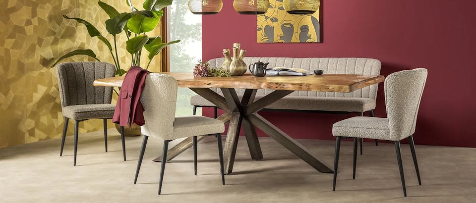 Een eetkamerbank is niet alleen een statement in je eethoek, maar ook verrassend veelzijdig in combinatie met verschillende stoelen. Speel met contrasten door een mix van materialen en vormen te kiezen. Denk aan een eetbank met een zachte bouclé of velvet bekleding, gecombineerd met stoelen van leder, hout of metaal voor een gebalanceerde uitstraling. Een speelse samenstelling, zoals een robuuste houten tafel met een mix van stoelen in diverse stoffen en kleuren, geeft je eethoek een persoonlijke en gelaagde look. Door deze mix van materialen ontstaat een interieur met karakter ideaal voor een sfeer die zowel warm als eigentijds aanvoelt.