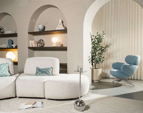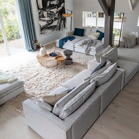 Een grote woonkamer vraagt om grote gebaren. Met grote meubels vul je de ruimte en voorkom je dat de woonruimte kil en leeg aanvoelt. Door verschillende woonfuncties te clusteren ontstaan sfeervolle, kleinere leefeilanden in de ruimte. Met een elementenbank creëer je bijvoorbeeld een groot ziteiland en tegelijkertijd ook veel flexibiliteit. Durf met een elementenbank out of the box te denken: de armleuning van het ene element kan prima dienen als rugleuning van een ander element. Op deze manier is het mogelijk aan alle kanten te zitten: richting de televisie, met zicht naar de tuin of in contact met de eethoek.
