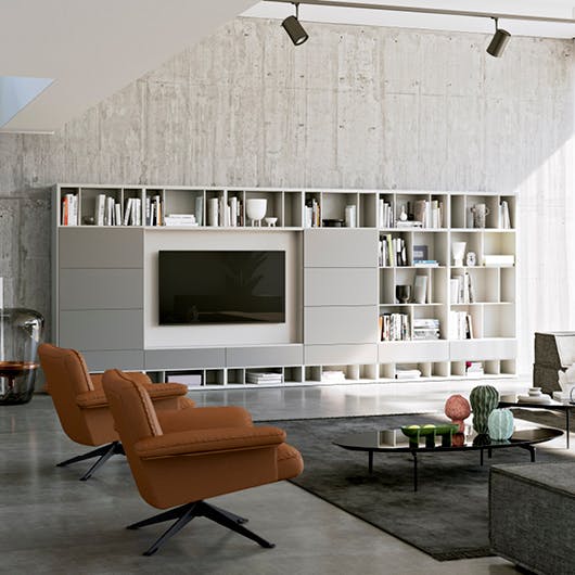 In een grote woonkamer is vaak in ieder geval één lange wand aanwezig. Wanneer hierin een raam of deur is geplaatst breken deze het kale geheel. Maar wanneer de muur helemaal leeg is, oogt een grote woonkamer al snel kil. Door een meterslange wandkast te plaatsen waarin diverse woonfuncties samen komen ontstaat een win-win situatie: je creëert opbergruimte, plek voor persoonlijke decoratie én de ruimte komt meer tot leven.