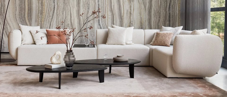 Naast ronde vormen, breng je ook eenvoudig warmte in huis met gebruik van de juiste materialen. Materialen als zijdezacht velvet en aaibaar bouclé geven je zitmeubels nét dat extra beetje comfort en zorgen voor een uitnodigende uitstraling. Maar denk ook aan warmgekleurd leder of hoogpolig wol. Combineer deze zachte materialen met levendig hout of marmer voor de perfecte balans. Tip: ga bij voorkeur voor licht hout. Donkere houtsoorten vormen wellicht een te groot contrast in je moderne interieur!