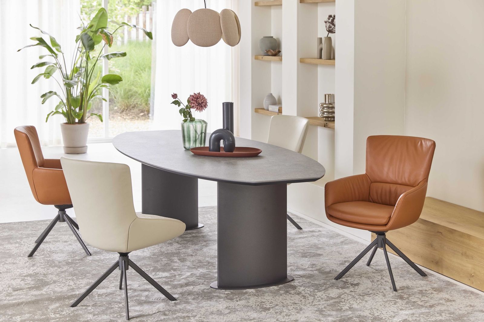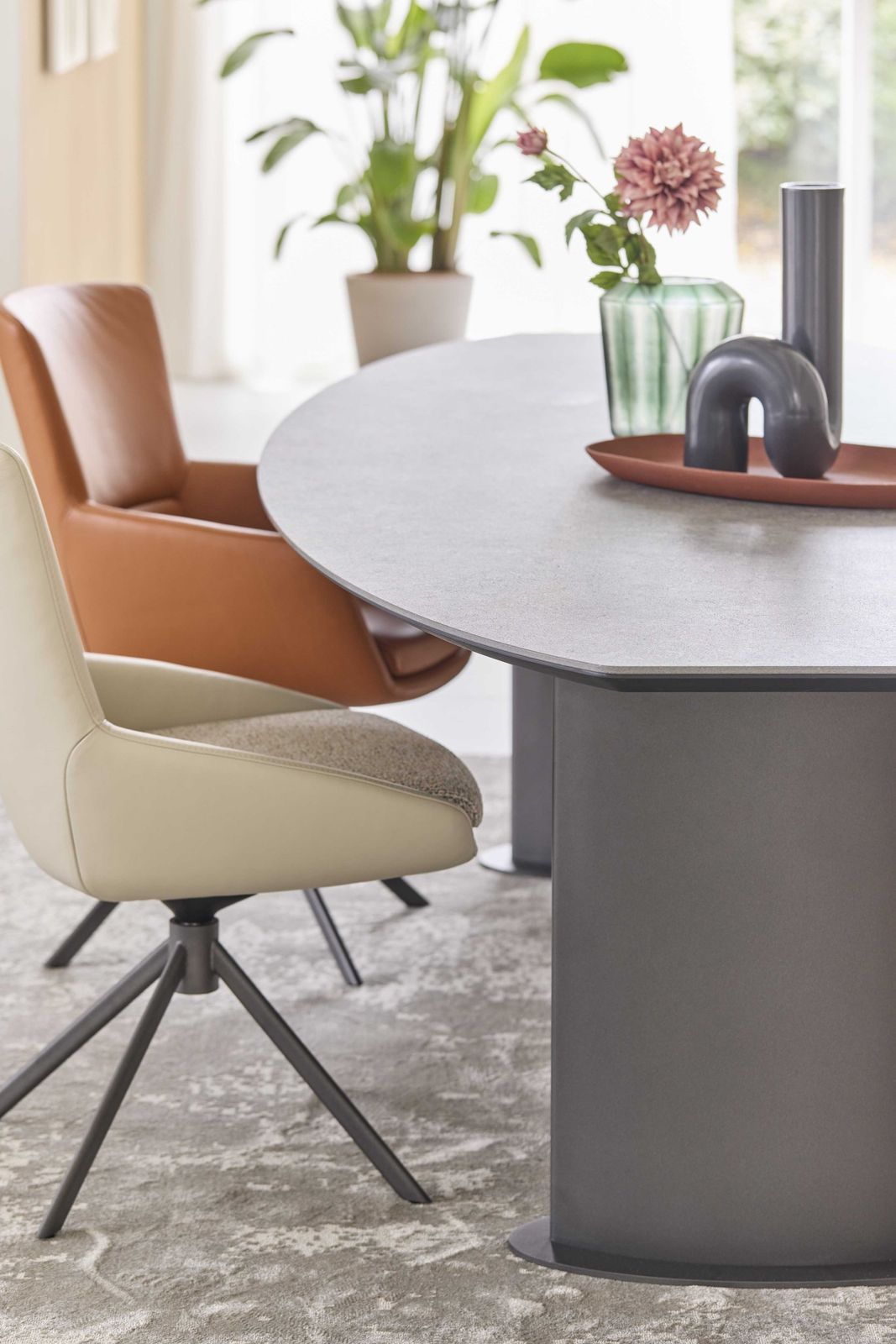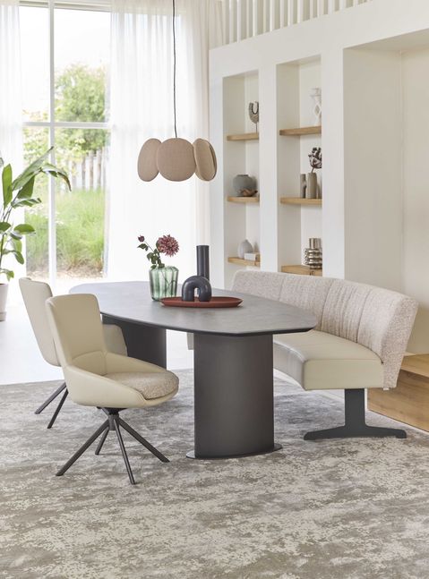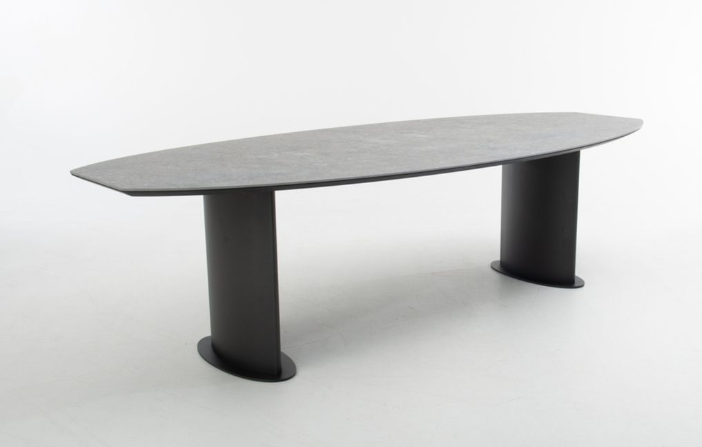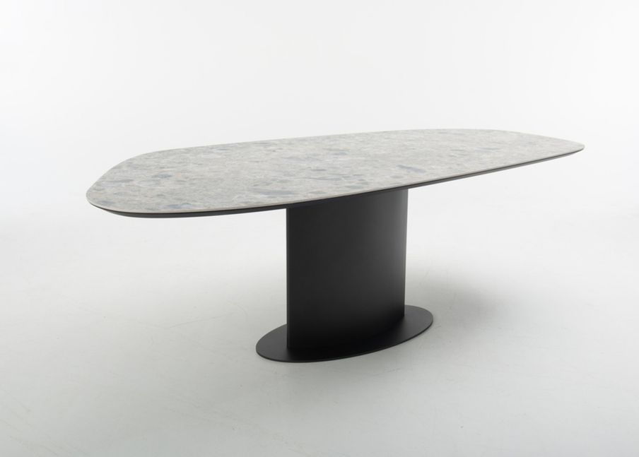 De Bert Plantagie Plato eettafel valt op door zijn elegante, organische vorm en krachtige materiaalgebruik. Het slanke, Deens ovale blad van Dekton geeft de tafel een verfijnde uitstraling en is dankzij de afgelakte afwerking bestand tegen intensief dagelijks gebruik. De robuuste, cilindervormige poten zorgen voor een stabiele basis en versterken het moderne karakter van het ontwerp. Als offerteartikel is de Plato eettafel verkrijgbaar in diverse materialen, kleuren en afmetingen, waardoor de tafel volledig kan worden afgestemd op de ruimte en persoonlijke woonstijl.