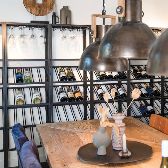 En in dit interieurplan werd ook Thomas woonwens gerealiseerd: een wijnbar in zijn eigen huis om gezellig te borrelen met familie en vrienden. Door maar liefst zes wijnkasten in een industrieel jasje - want van zwart staal - tegen elkaar te plaatsen ontstaat er zeeen aan ruimte om je favoriete flessen wijn stijlvol op te bergen. Ook fijn: de wijnglazen heb je direct bij de hand, want deze hang je gewoon bovenin op de kast. Proost, het weekend kan beginnen!