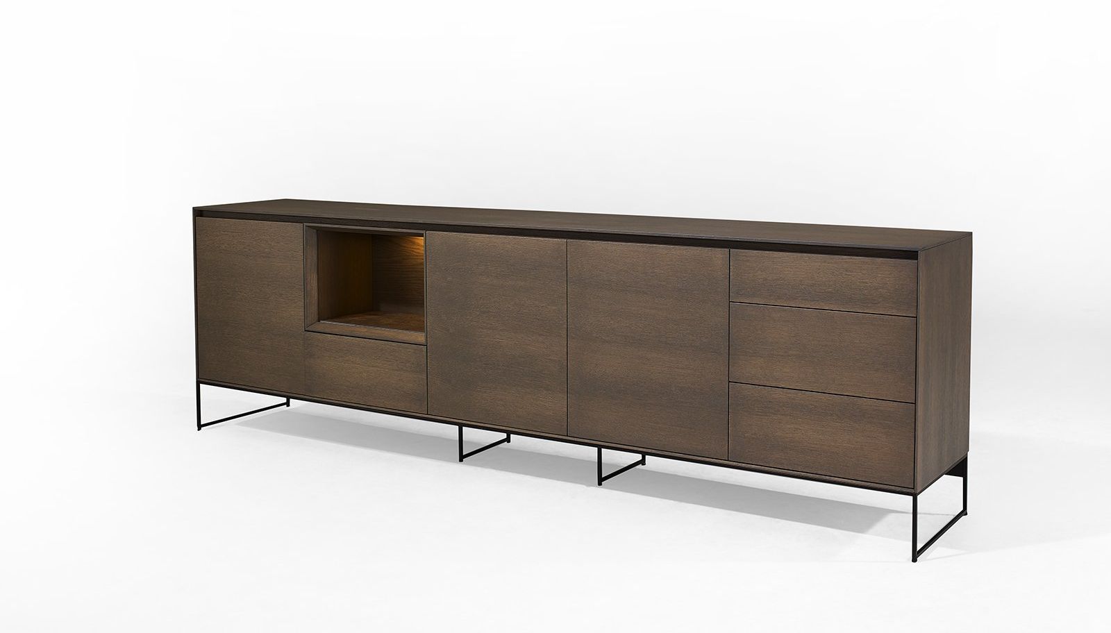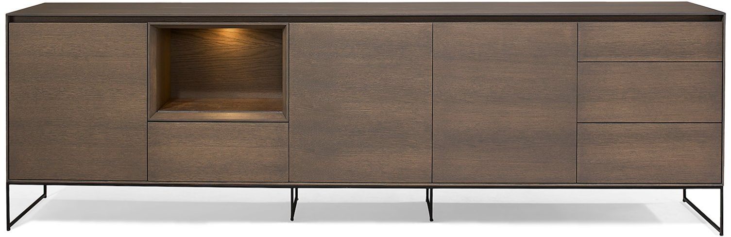 Dressoir Zen van Crest valt op door zijn strakke belijning en warme houttint, gecombineerd met een slank metalen onderstel dat zorgt voor een luchtige uitstraling. De opbergvakken en lades bieden praktische ruimte, terwijl het open vak met verlichting een subtiel accent toevoegt.