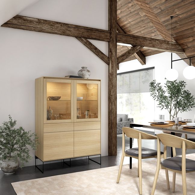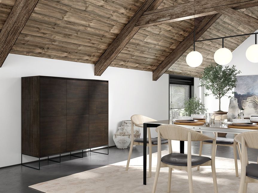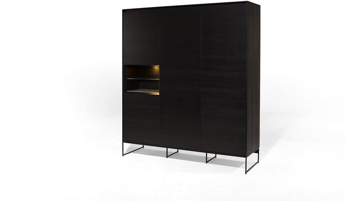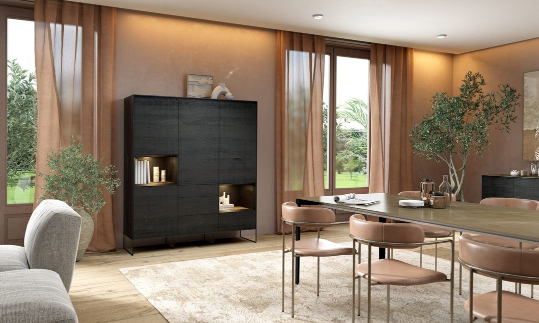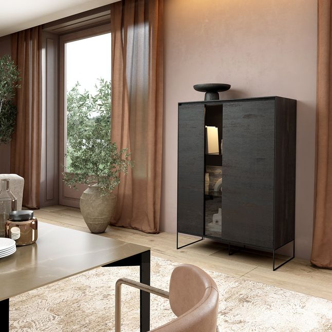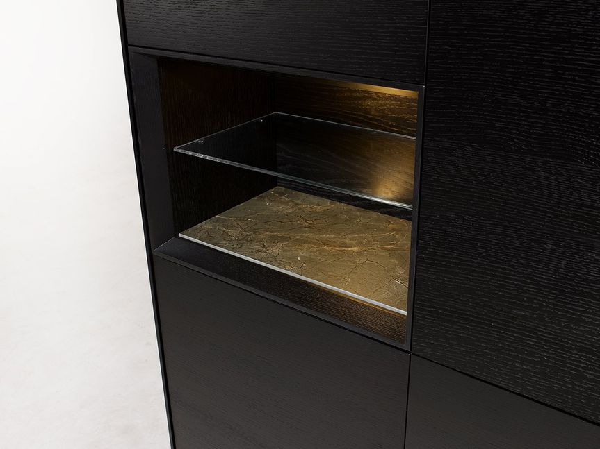 De Zen opbergkast van Crest heeft een strak en minimalistisch ontwerp, uitgevoerd in een diepe houttint en geplaatst op een slank metalen onderstel. De gesloten fronten zorgen voor een rustig geheel, terwijl de open nis met subtiele verlichting ruimte biedt om accessoires stijlvol te presenteren. Deze opbergkast is volledig samen te stellen naar eigen wensen, van indeling tot afwerking. Zo creëer je een kast die perfect aansluit bij jouw interieur en opbergbehoefte.