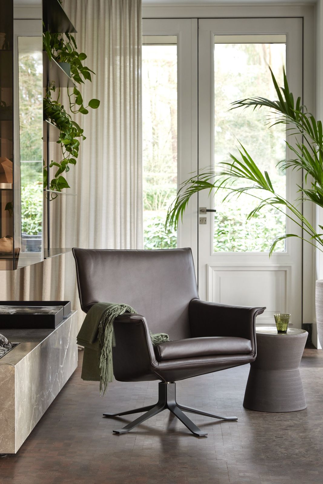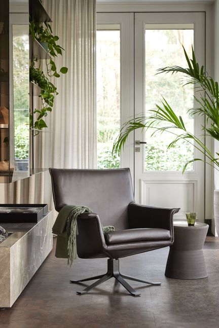 De strakke belijning van de draaifauteuil loopt in één beweging door van de rug, naar de armleuningen, tot het onderstel. Een opvallend detail is het uiteenlopende onderstel dat door de platte uiteinden lijkt te integreren met de vloer. Gerard van den Berg heeft in zijn ontwerp veel aandacht besteed aan het zitcomfort, zoals de zitting van de fauteuil die iets naar achter helt. Tevens biedt de hoge rugleuning een optimale ondersteuning aan de schouders en het losse kussen geeft een stevige zit. De fauteuil is verkrijgbaar in diverse rijke stof- en hoogwaardige leersoorten.