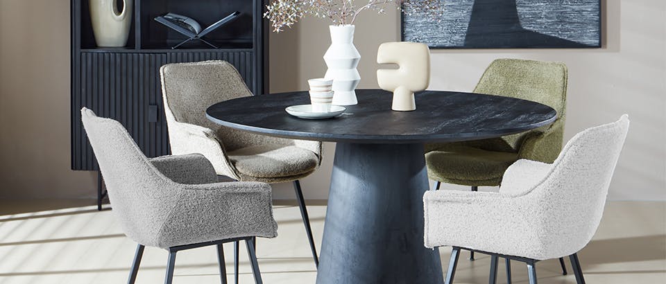 Bij een ronde eettafel horen natuurlijk bijpassende eetkamerstoelen. Door te kiezen voor stoelen met ronde vormen, zoals kuipstoelen of gestoffeerde stoelen met een zachte bekleding, versterk je het speelse en uitnodigende effect van de tafel. Heb je een industriële tafel? Dan zorgen stoelen met metalen accenten of een leerlook voor een mooie balans. Wil je meer dynamiek in je interieur? Kies dan voor een mix van verschillende stoelen rondom je ronde tafel.