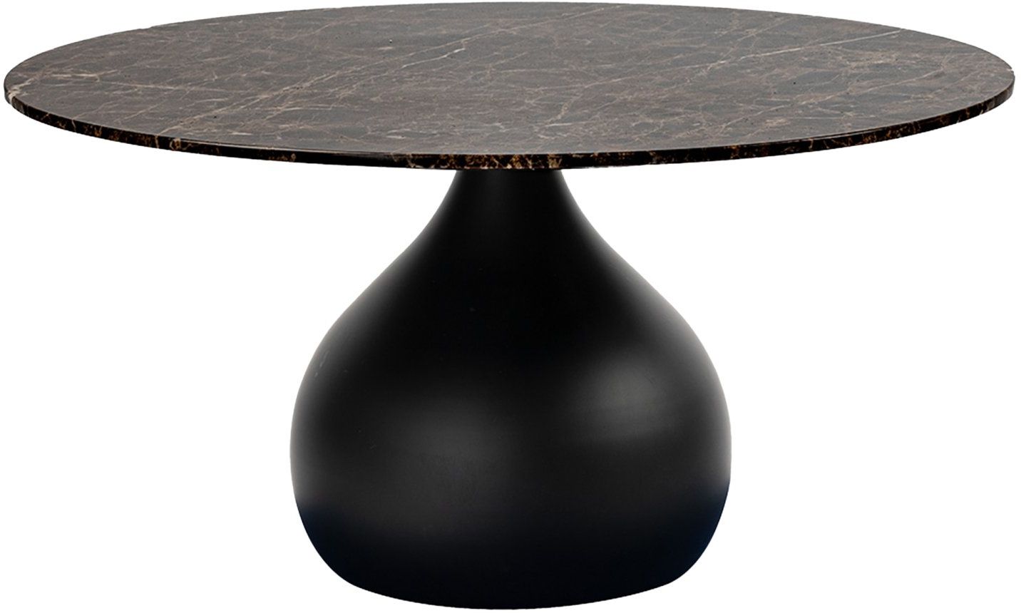 Breng balans in je eetruimte met de Coco eettafel uit de Eijerkamp Collectie. Het ronde tafelblad van donker marmer rust op een robuuste, druppelvormige voet in matzwart metaal. Deze combinatie zorgt voor een moderne en verfijnde uitstraling. Dankzij de centrale poot is er rondom de tafel voldoende beenruimte, wat zorgt voor extra zitcomfort.