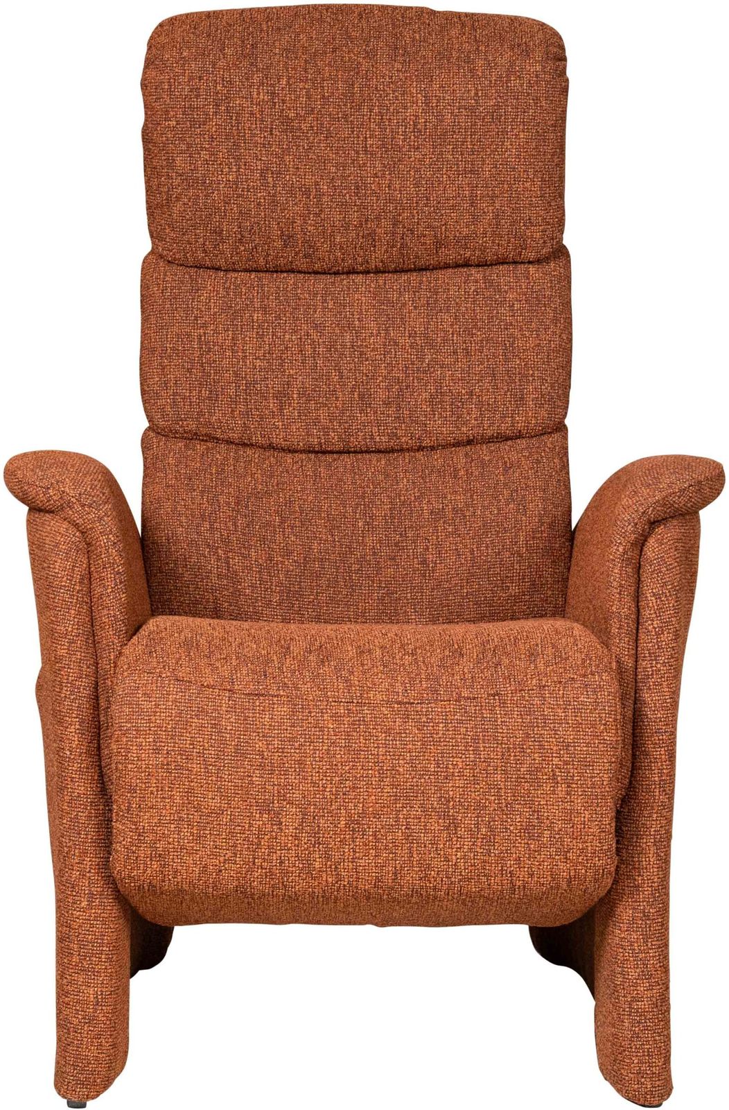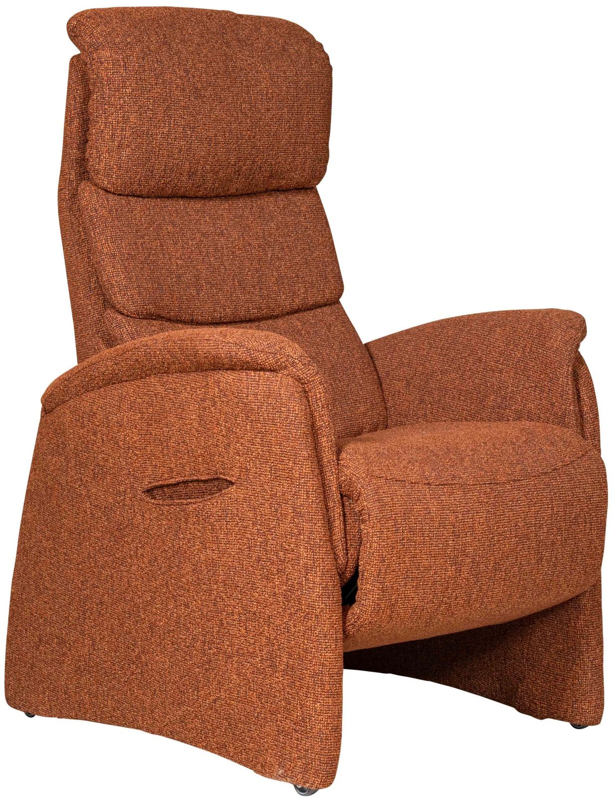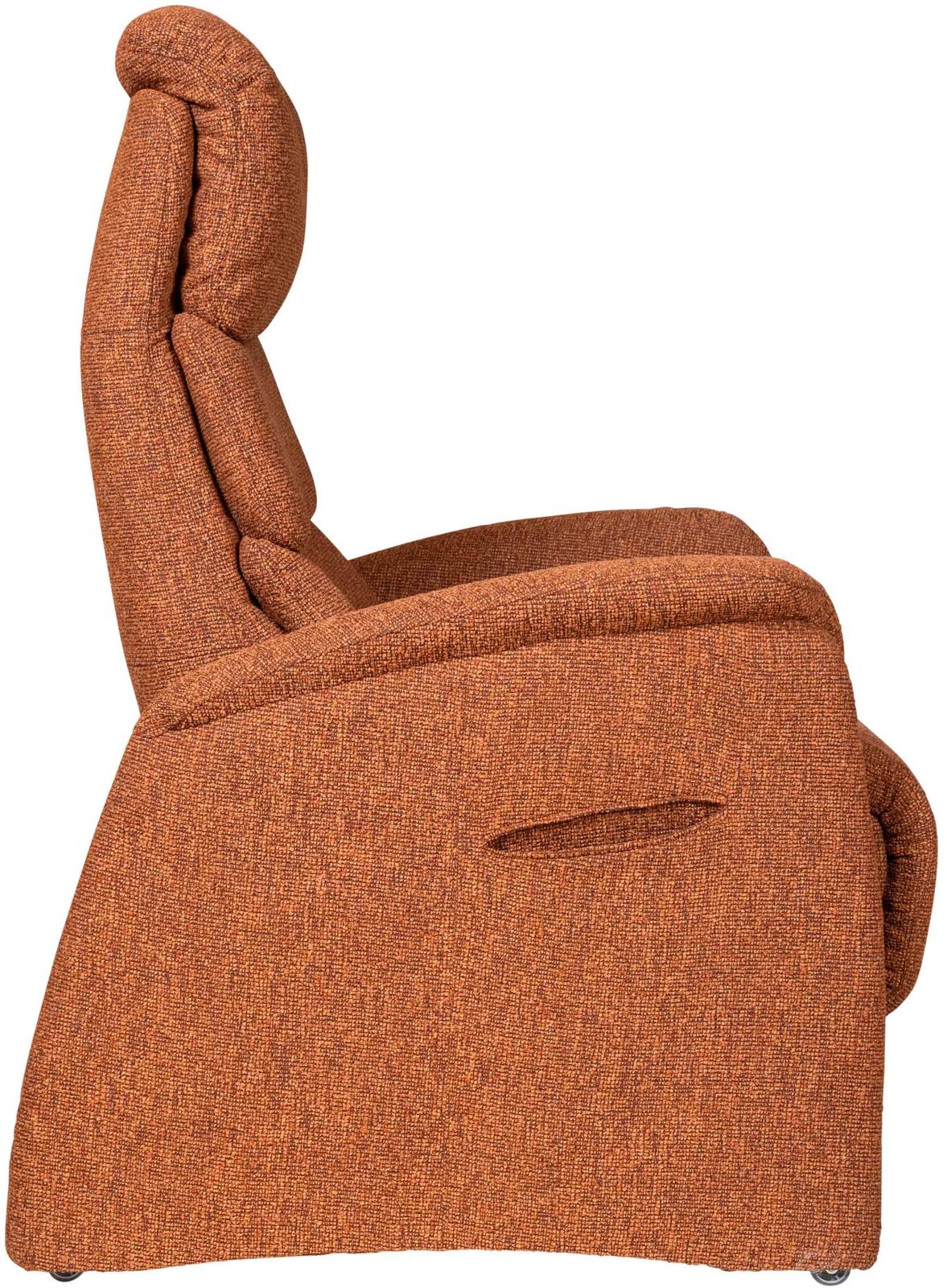 De getoonde uitvoering is bekleed met de stof Loft in de kleur Terra, een warme oranje-rode tint met subtiele kleurnuances binnen de Terra kleurgroep. Deze rijke stoffering geeft de fauteuil extra diepte en benadrukt de robuuste vorm van het ontwerp.