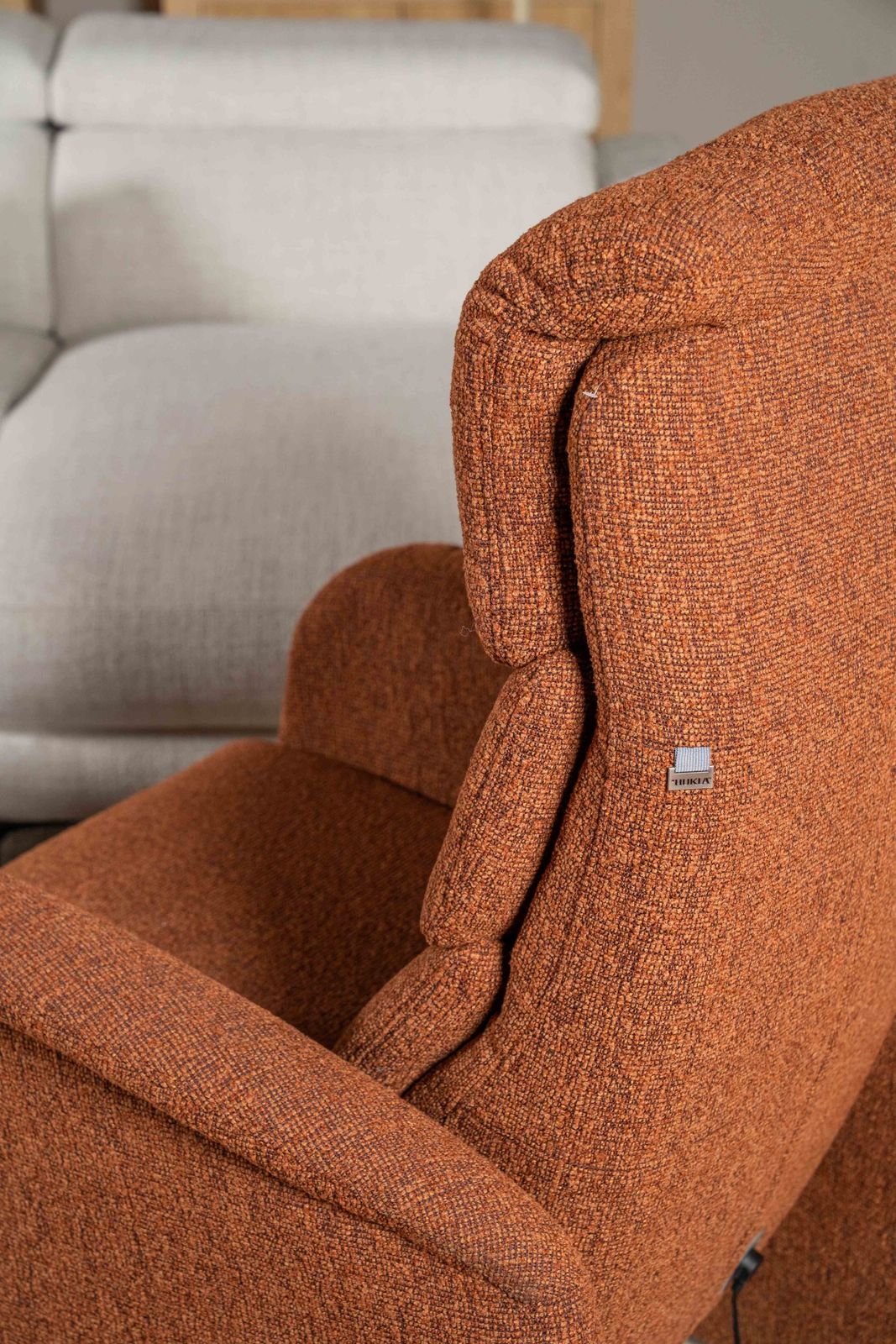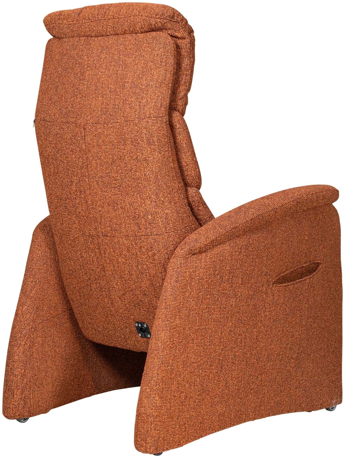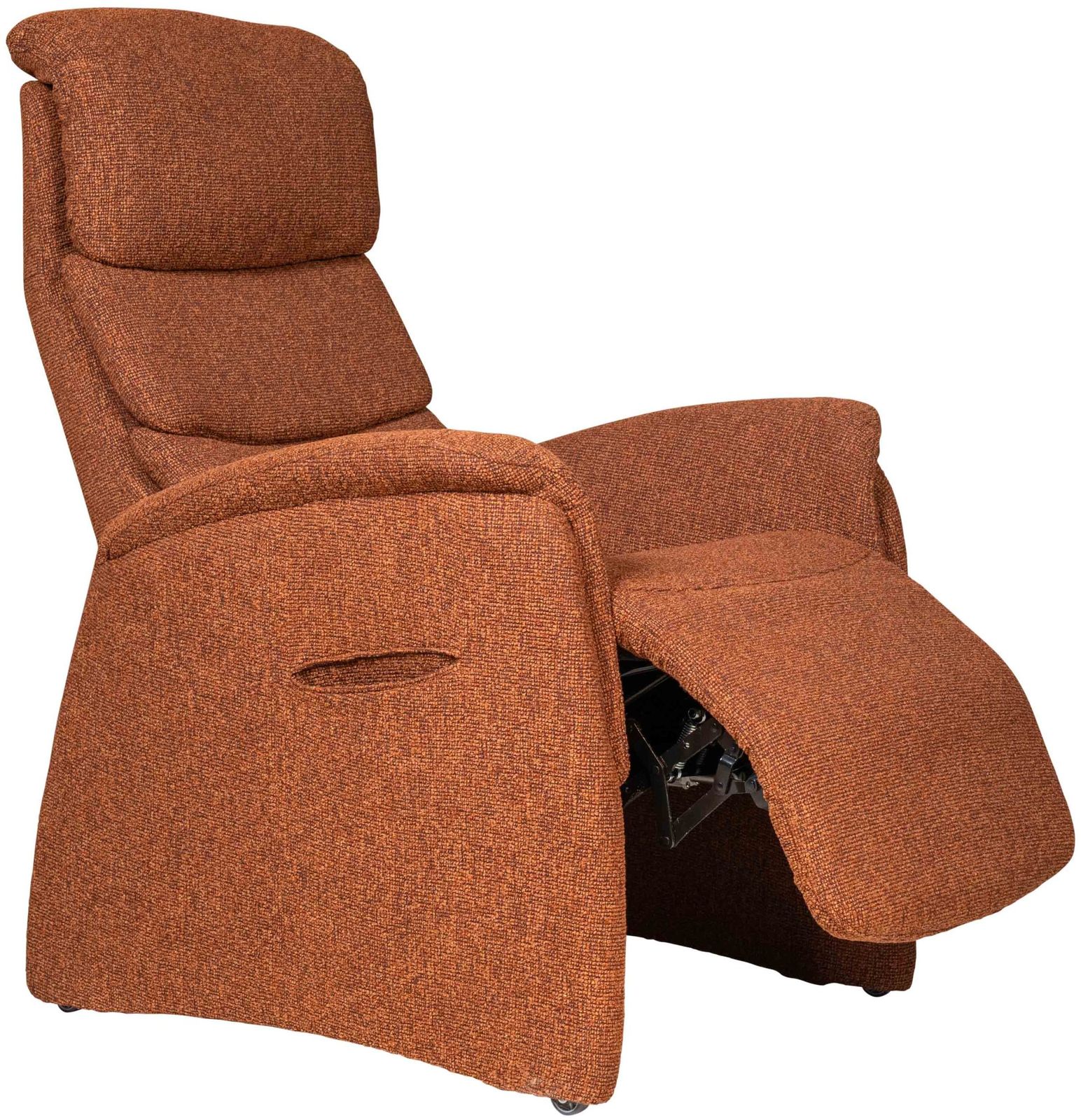 De getoonde uitvoering is bekleed met de stof Loft in de kleur Terra, een warme oranje-rode tint met subtiele kleurnuances binnen de Terra kleurgroep. Deze rijke stoffering geeft de fauteuil extra diepte en benadrukt de robuuste vorm van het ontwerp.