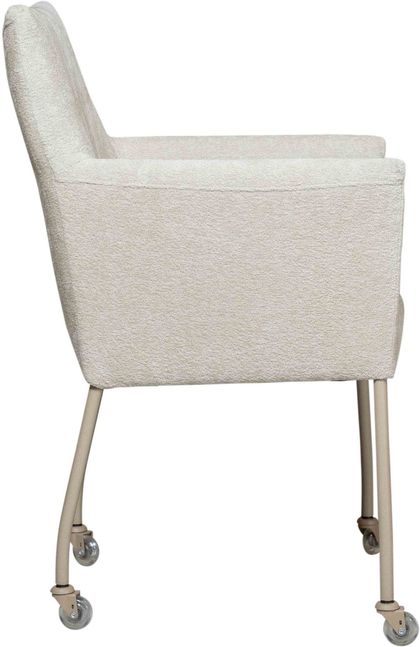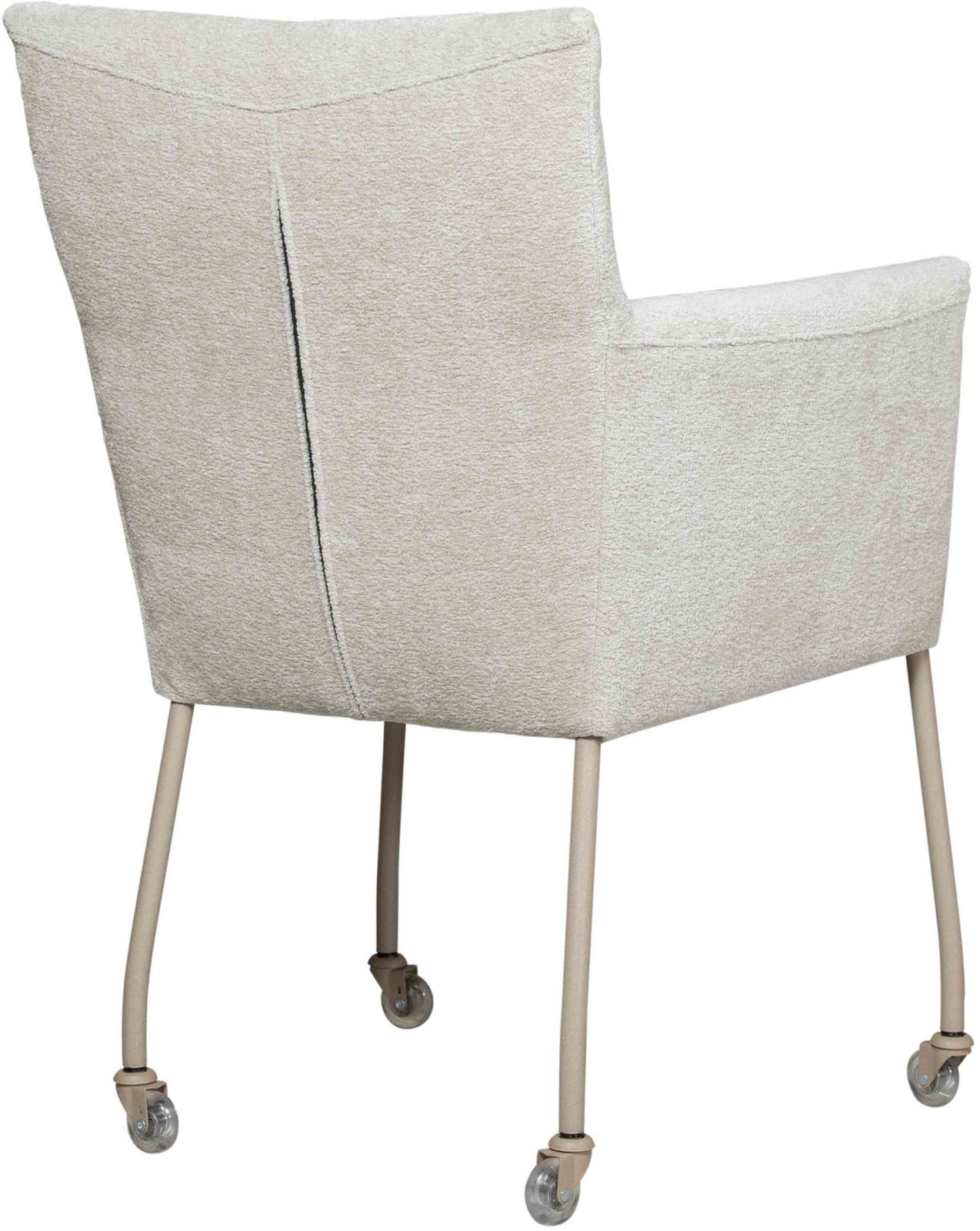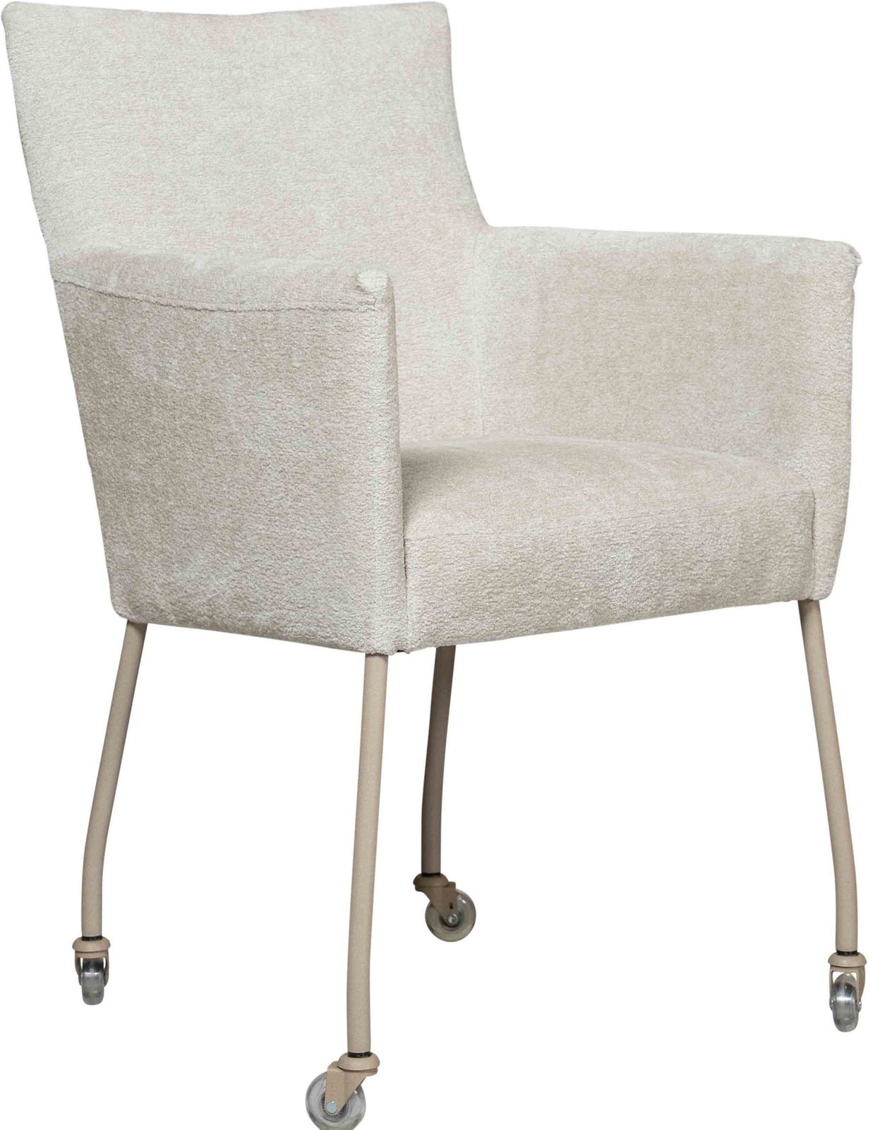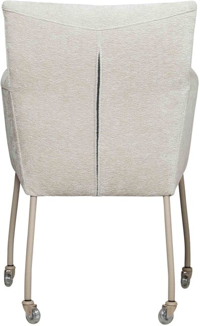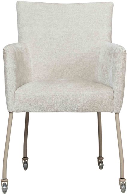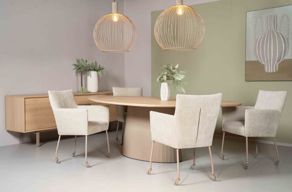 Eetkamerstoel Gastone uit de Eijerkamp Collectie vormt een moderne toevoeging aan de eetruimte, waarin praktisch gebruik en eigentijds design samenkomen. Het hoekige ontwerp geeft de stoel een tijdloze uitstraling, terwijl het beige onderstel zorgt voor een subtiel en actueel accent. De bekleding in de stof Stella in naturelkleur heeft een zachte velvet look, wat een warme en verfijnde sfeer aan de eethoek toevoegt. Dankzij de geïntegreerde wielen schuif je de stoel eenvoudig aan tafel, wat het dagelijks gebruik extra comfortabel maakt.