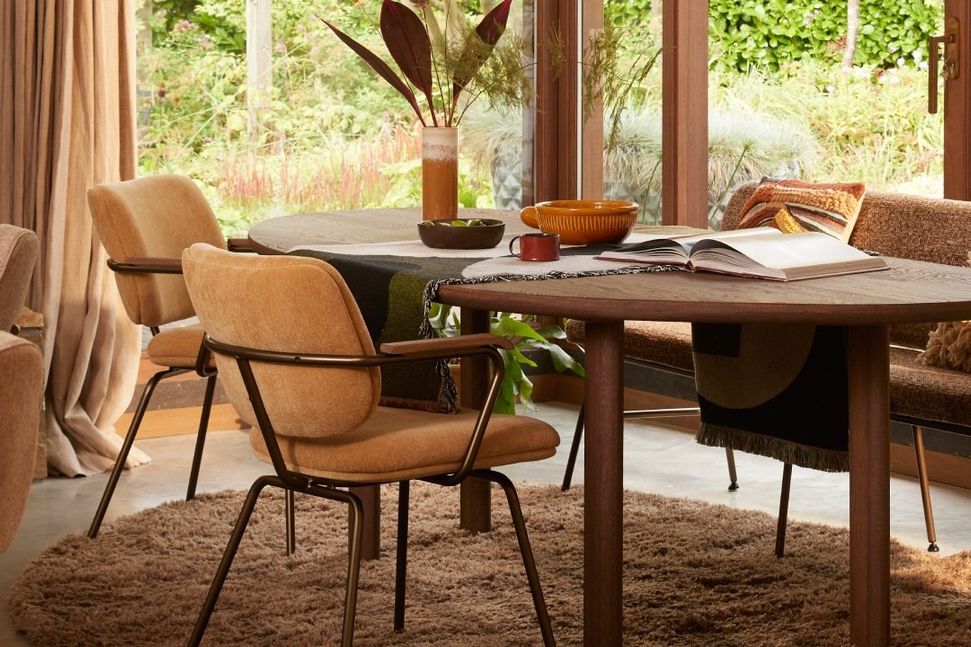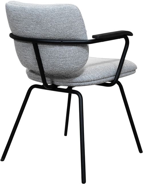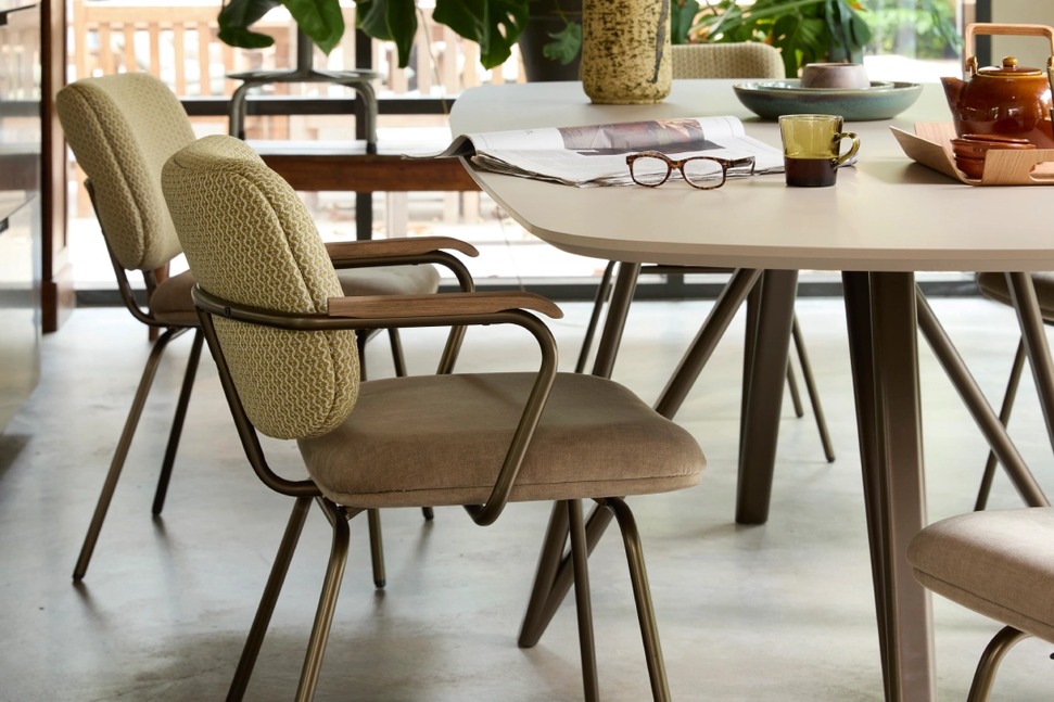 De Kobe armstoel van Eijerkamp Collectie valt op door zijn elegante belijning en hoogwaardige afwerking. Het zwarte metalen frame op doppen met vilt zorgt voor stabiliteit én vloervriendelijkheid. De armleuningen in mat gelakte kleur espresso geven de stoel een warme, verfijnde uitstraling. Dankzij de comfortabele zitting en stevige ondersteuning is Kobe ideaal voor lange diners.