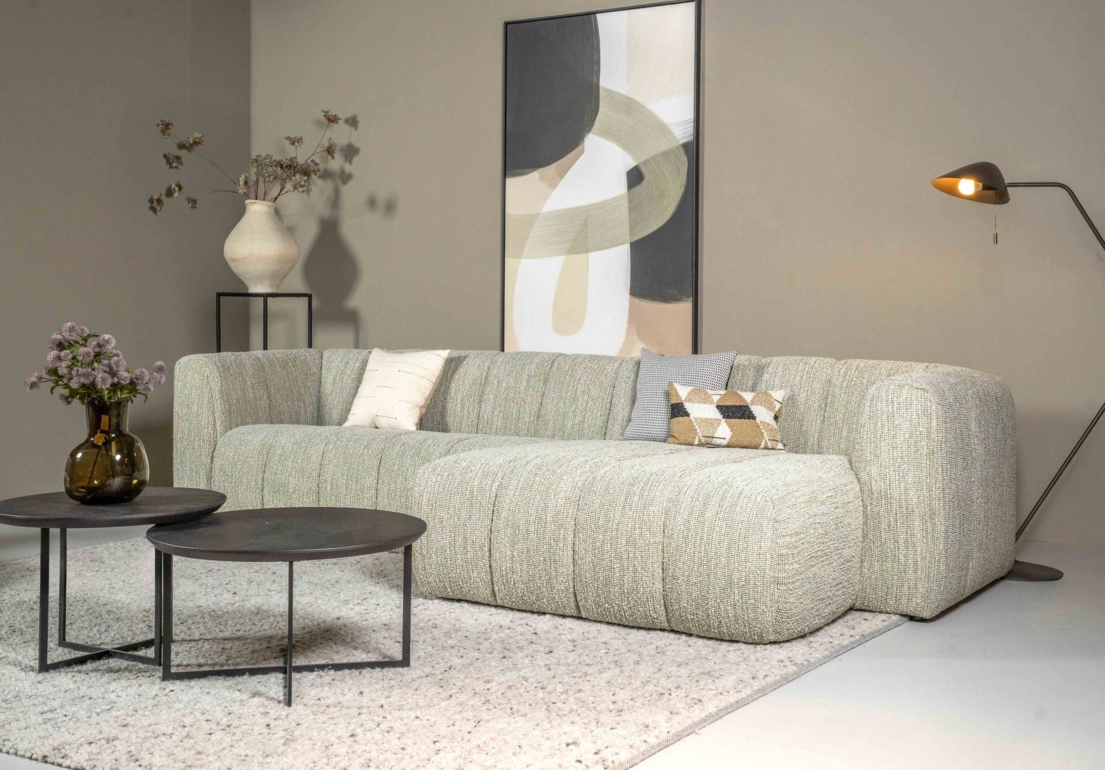 Hoekbank Lance uit de Eijerkamp Collectie brengt een hedendaagse Scandinavische uitstraling in de woonruimte. De strakke vormgeving in combinatie met gecapitonneerde details geeft de bank een herkenbaar en eigentijds karakter. De uitvoering in stof Premium in een subtiele groentint voegt op een rustige manier kleur toe aan het interieur en laat zich eenvoudig combineren met andere meubels en materialen. Hierdoor ontstaat een harmonieus geheel zonder dat de bank overheerst. De geïntegreerde longchair biedt extra comfort en nodigt uit tot ontspannen zitmomenten.