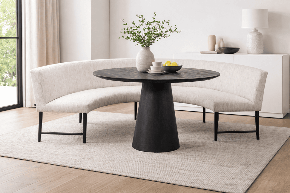 Eetkamerbank Simon uit de Eijerkamp Collectie vormt de ideale aanvulling op een ronde eettafel. Het bankje is vervaardigd uit een fijne stof, waarmee Simon een moderne toevoeging is aan jouw eetruimte. De zachte, aardse tint geeft de eetruimte een vriendelijke en uitnodigende uitstraling. Het donkerbruine onderstel voegt daar een warme noot aan toe, waardoor een sfeervol en harmonieus geheel ontstaat.