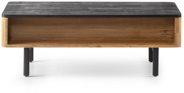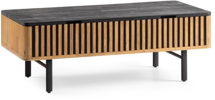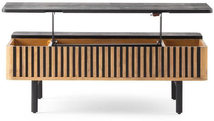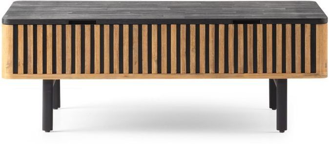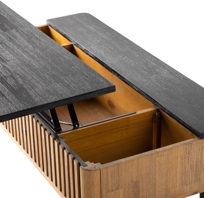 De salontafel Larvik uit de Feelings-collectie is een perfecte aanwinst voor elke woonruimte, vooral vanwege zijn unieke opbergmogelijkheden. Deze tafel heeft een opmerkelijk tafelblad dat omhoog kan worden gebracht om spullen in op te bergen. De salontafel is vervaardigd uit acaciahout en straalt daardoor warmte en tijdloze charme uit. Larvik staat op een eigentijds zwart onderstel, wat een verfijnd contrast vormt met het caramelkleurige hout.