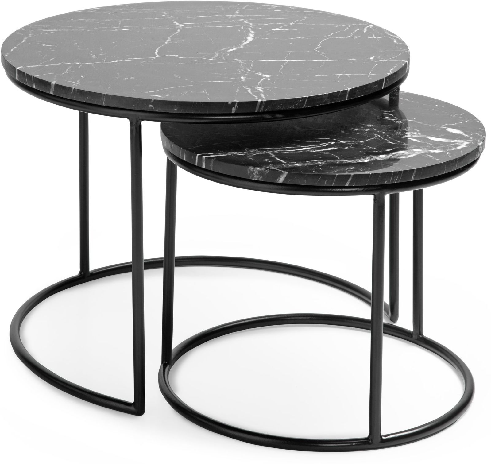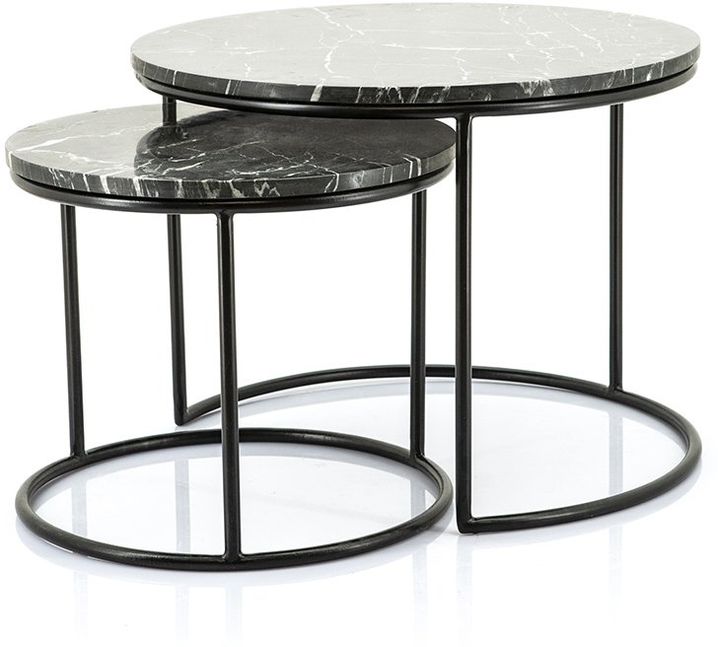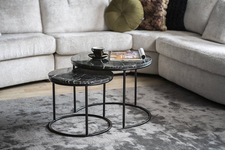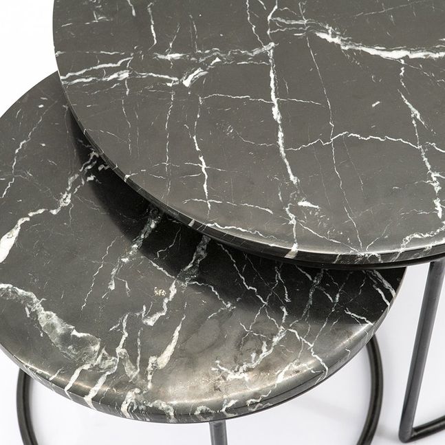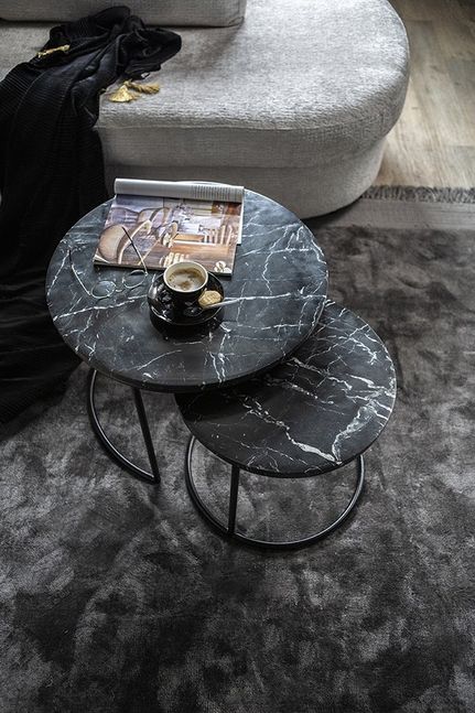Romeo bijzettafelset van Feelings is een set van twee zwarte ronde bijzettafels met geaderd marmeren blad die eenvoudig onder elkaar geschoven kunnen worden. De ronde bijzettafels hebben een zwart metalen frame en elk blad is uniek door het kenmerkende patroon van deze marmeren steensoort.