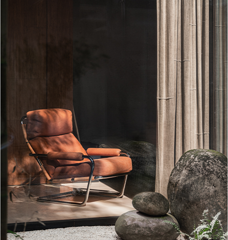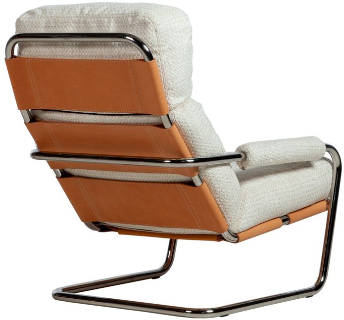 Een stoel met karakter, door de rug- en zitkussens voorzien van de nonchalante stoffering en het opvallende ijzeren buisframe. Daarnaast is de zitcomfort uitstekend door de royale kussens, de fijne hoofdsteun en de comfortabele armleggers. Het frame is gemaakt van chroom en bespannen met zwart tuigleer. Voor nog meer comfort zijn de armleggers gestoffeerd.