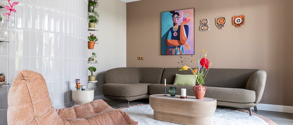 De ronde muur in de woonkamer: het was liefde op het eerste gezicht voor Desiree & Joram, maar blijkt toch ook een uitdaging bij de inrichting. Frans omarmt de ronding en laat deze vorm overal terugkomen, zo ontstaat een fijn geheel. De hoekbank met ronde vormen, een rond vloerkleed én eettafel die op het eerste oog rond lijkt, maar dat net niet is: alles smelt perfect samen! Het kleurenpalet is basic met her en der een flink kleurstatement!