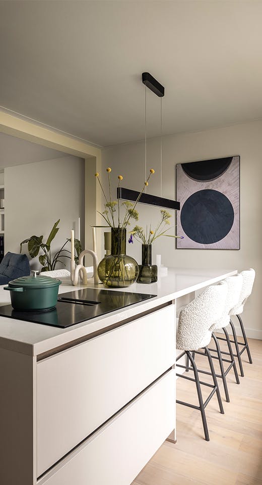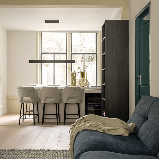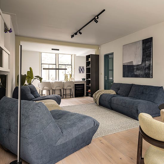 "Thomas is gek op blauw, dus die kleur verwerken we op een mooie manier in het interieur. We combineren dit met karaktervolle vintage meubels en een sfeervol bistrotafeltje. Voor Ilona voegen we zachte stoffen toe voor extra warmte. De bank is royaal en comfortabel, waardoor zowel Thomas als Ilona daar zeker blij van worden."