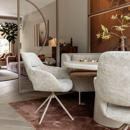 "Het nieuwe interieur ademt licht, zachte tinten en romantiek met subtiele statements. De zithoek biedt royale zitplekken met een rechte bank én een ronde bank in de erker. De eethoek biedt intimiteit waar compactheid en omhullende meubels een warme, gezellige sfeer creëren."