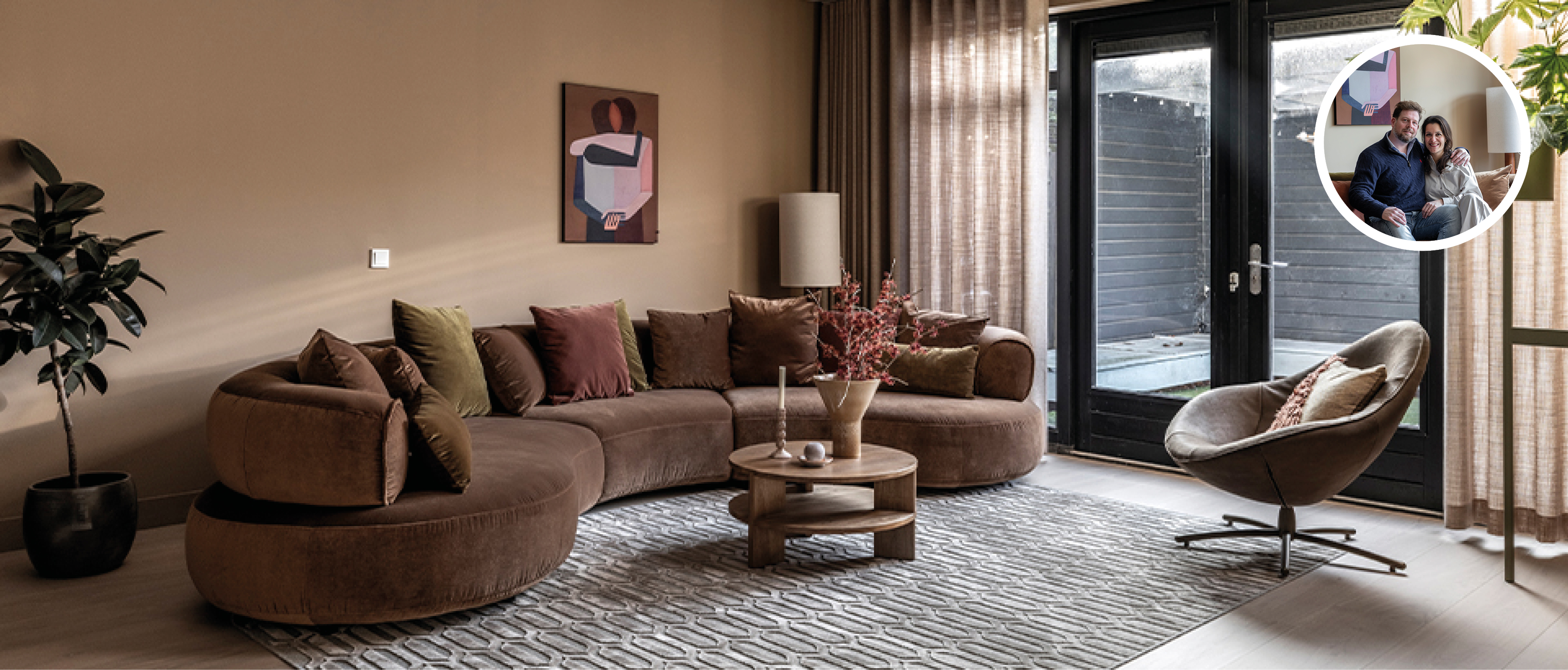 "Door één rustige basis te creëren ontstaat samenhang in de ruimte. De donkere vloeren worden vervangen door één lichtere vloer die doorloopt in alle ruimtes, waardoor het huis visueel met elkaar verbonden wordt. Warme kleuren en rijke materialen zorgen voor een zachtere, chique sfeer. In de woonkamer brengt een bank met een halve ronding meer intimiteit in de zithoek, aangevuld met fauteuils van buffelleer. De eethoek krijgt een bijzonder accent met panelen op de wand én het plafond, waardoor de ruimte verandert in een warme cocon waar het gezin graag samenkomt."
