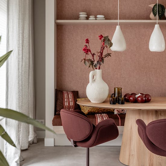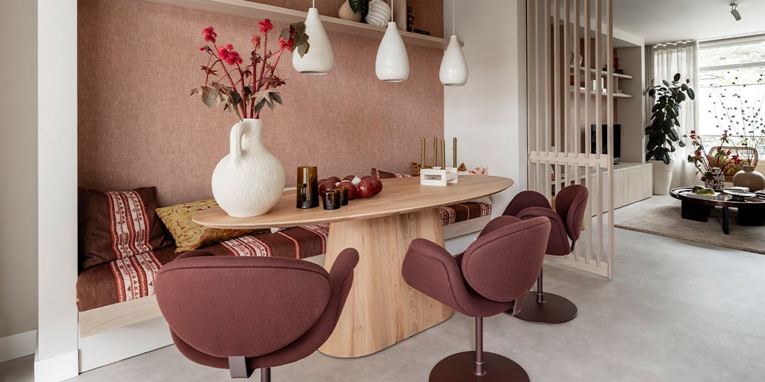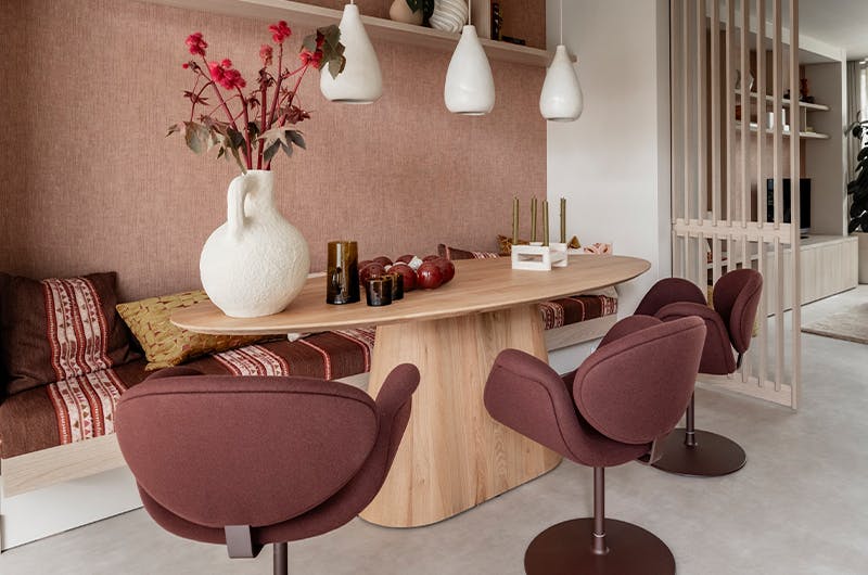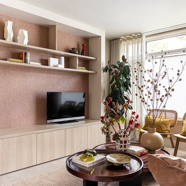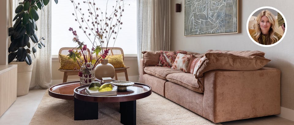"De make-over ‘Praktisch & Pioenroze’ draait om balans. Voor Rob ligt de focus op praktische oplossingen, terwijl Anne haar liefde voor roze terugziet in een zachte relaxbank en kleurrijke accenten. Rustige fauteuils en een licht vloerkleed brengen evenwicht, terwijl de ovale tafel en het wandbankje extra ruimte en luchtigheid creëren."