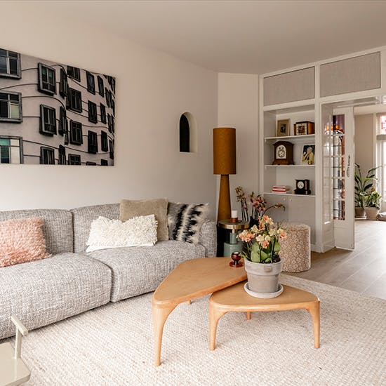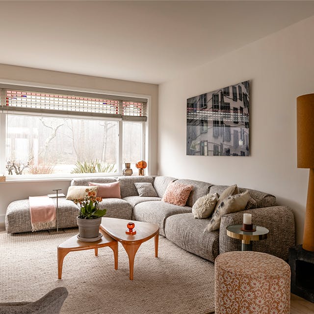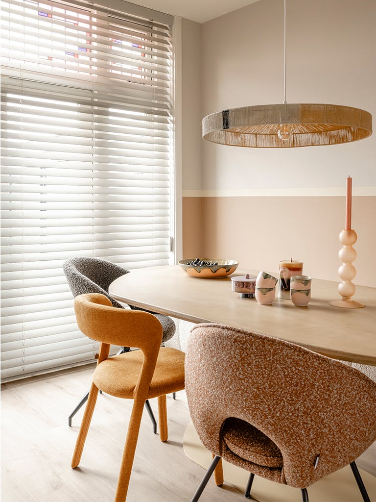 "Voor Erwin komt er een royale loungebank om heerlijk te ontspannen. Voor Anouk zorgen bloemen en veel licht voor een warme sfeer. De organische eettafel in een oranje tint wordt gecombineerd met diverse stoelen, waardoor kleuraccenten subtiel terugkomen en het geheel een speels en harmonieus karakter krijgt."