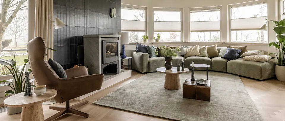"De ronde architectuur vormt de basis, waarbij maatwerk zorgt voor een logische indeling. Een volledig op maat samen te stellen bank met zachte rondingen sluit aan op de ruimte en benut deze optimaal. De deens ovale tafel versterkt de vloeiende lijnen en zorgt voor een natuurlijke indeling. Blauw- en groentinten, natuurprints en warme materialen brengen buiten naar binnen. Groene en houttinten zorgen voor sfeer, terwijl accenten in blauw en warm leer balans brengen. Zo ontstaat een harmonieus geheel met een duidelijke, doorlopende lijn in het interieur.”