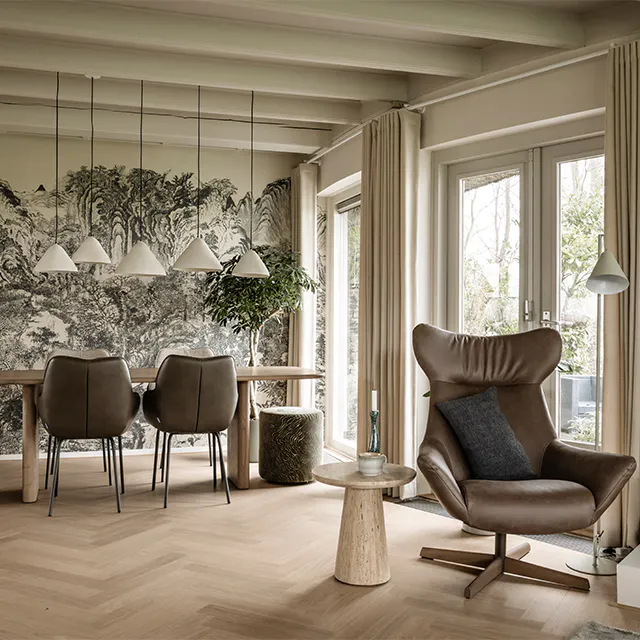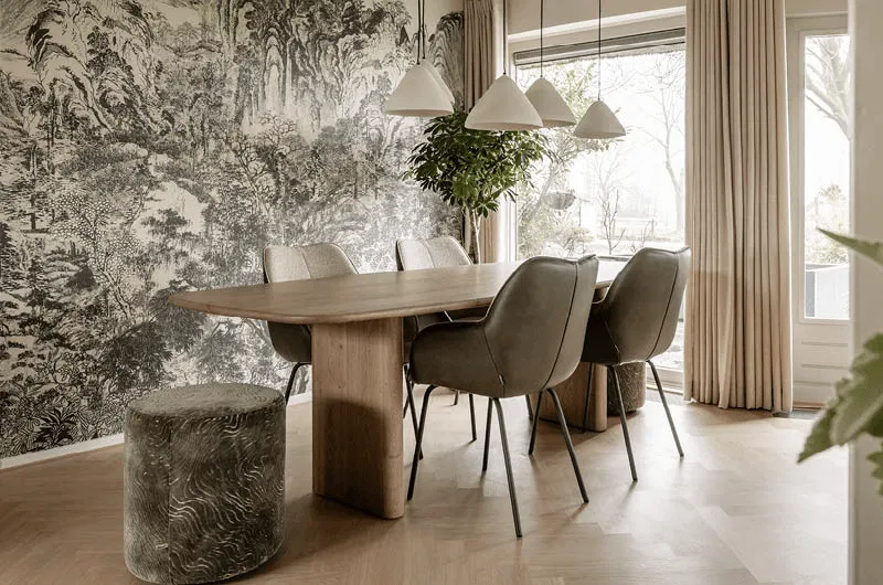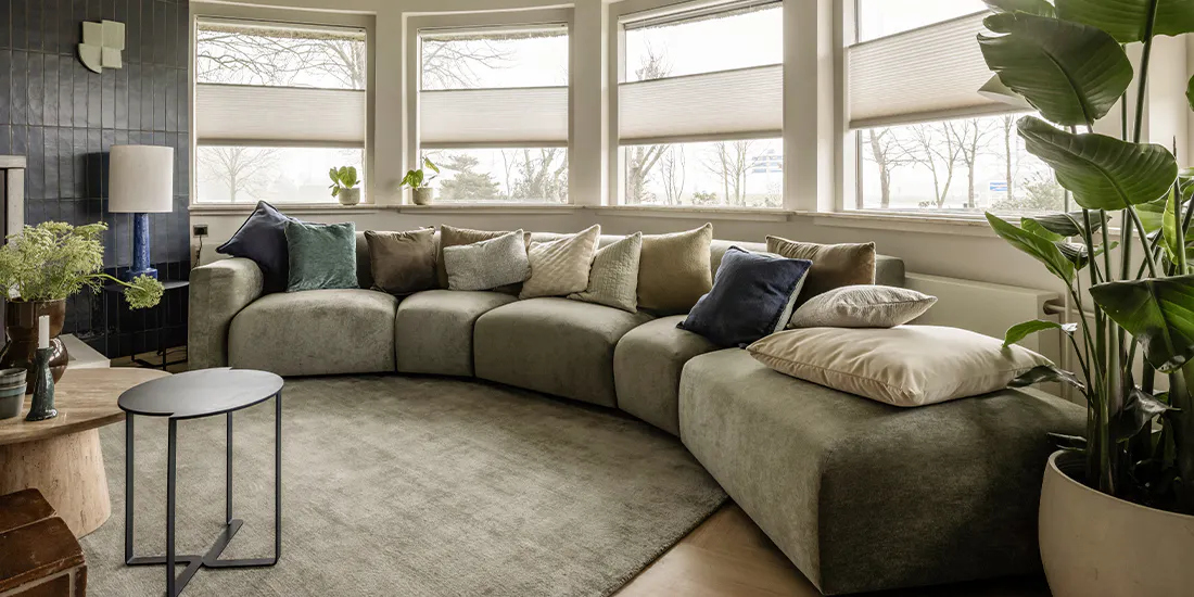 "De ronde architectuur vormt de basis, waarbij maatwerk zorgt voor een logische indeling. Een volledig op maat samen te stellen bank met zachte rondingen sluit aan op de ruimte en benut deze optimaal. De deens ovale tafel versterkt de vloeiende lijnen en zorgt voor een natuurlijke indeling. Blauw- en groentinten, natuurprints en warme materialen brengen buiten naar binnen. Groene en houttinten zorgen voor sfeer, terwijl accenten in blauw en warm leer balans brengen. Zo ontstaat een harmonieus geheel met een duidelijke, doorlopende lijn in het interieur.”