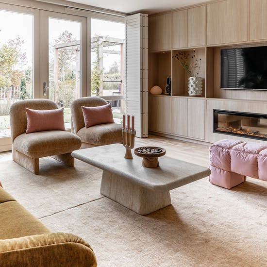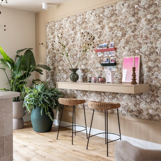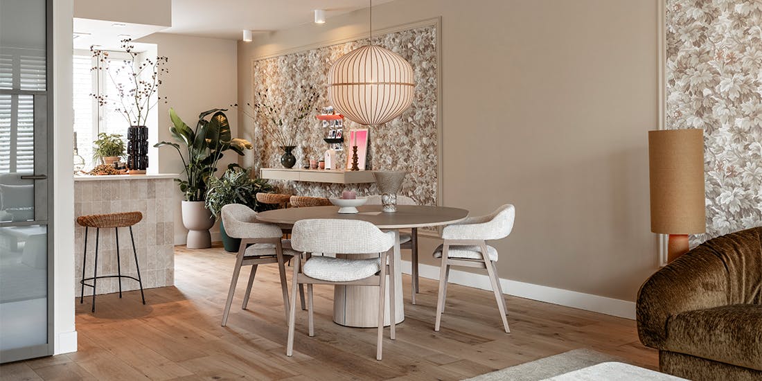 "Het interieur ademt de Beachy Landhuis-stijl, met nude tinten, roze accenten en blond hout. Zachte stoffen, een royale uitschuifbare eettafel en een open wandkast vol accessoires brengen sfeer en functionaliteit samen. Donkergroene elementen, sierlijsten en natuurlijke materialen zorgen voor een stijlvolle balans tussen speels en chic."