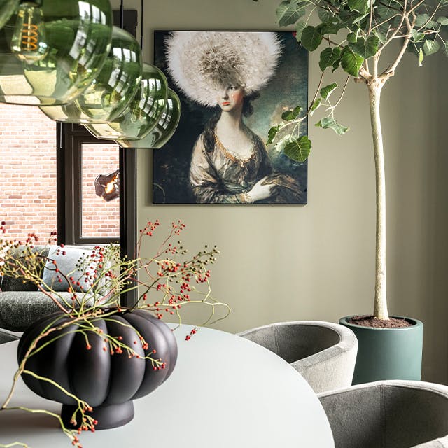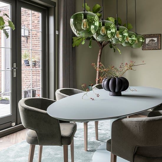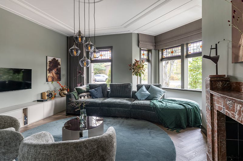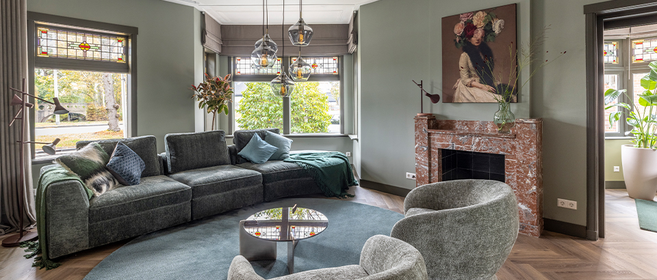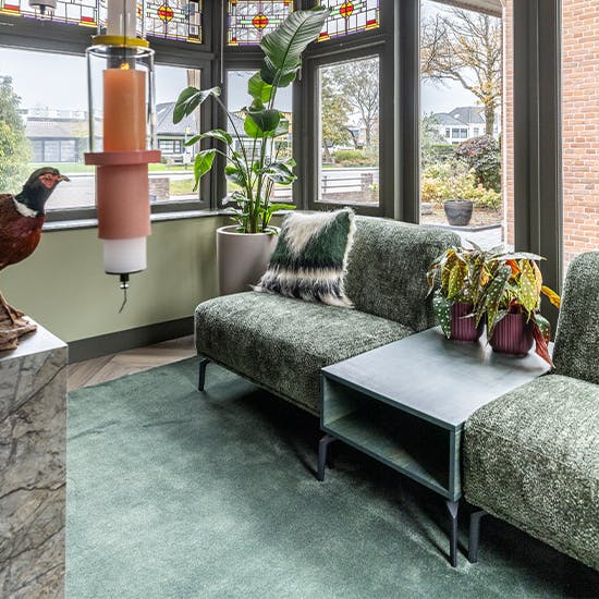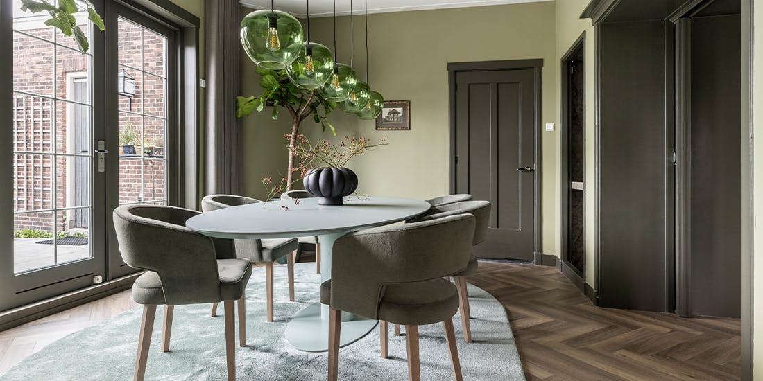 "De inrichting krijgt een stijlvolle Hotel Blend uitstraling met een melange van groentinten. De royale elementenbank vormt het hart van de woonkamer en sluit vloeiend aan op het zachte vloerkleed. In de eetkamer komt een monochroom palet van groen terug in de eetkamerstoelen, de eettafel en het vloerkleed voor een harmonieuze sfeer."