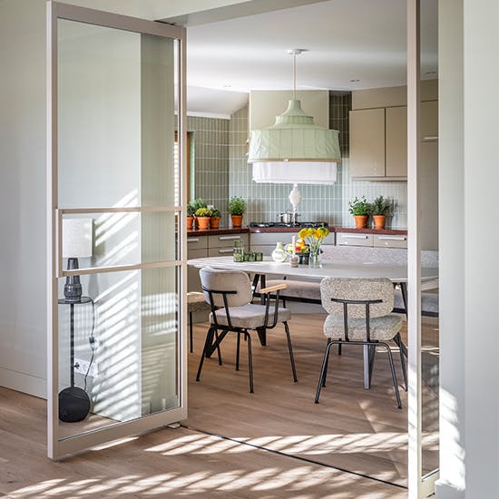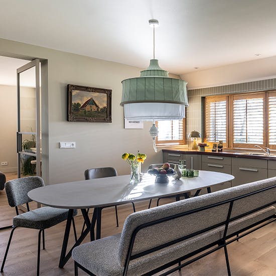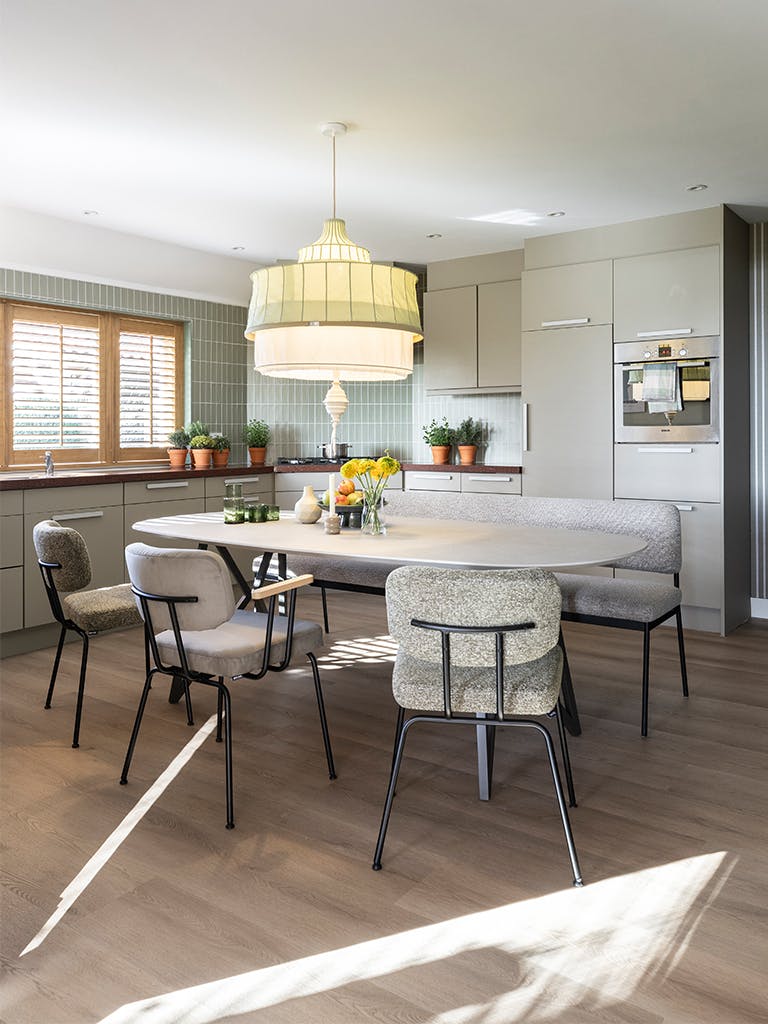 "De zithoek krijgt meer functies: een knusse plek bij de haard en een praktische zit bij de tv. De woonkeuken blijft het hart van het huis, met een royale eettafel, veel stoelen en een eetkamerbank. Ideaal voor lange, gezellige momenten samen."