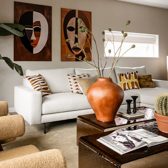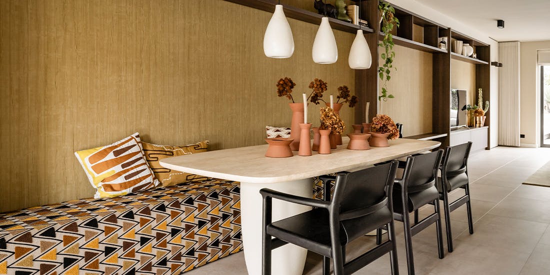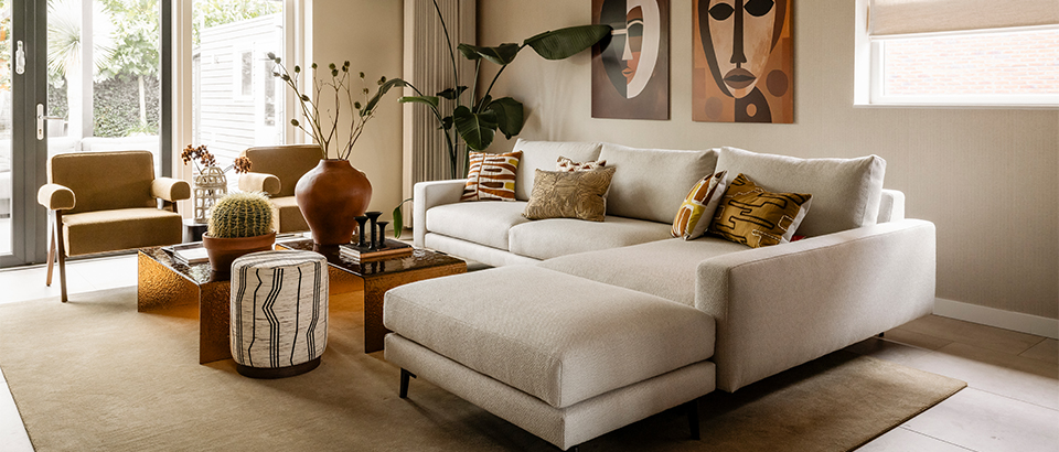 "Van savanne tot suite: warme tinten, donker hout en Afrikaanse invloeden vormen een harmonieus interieur. De bank biedt Mirthe een comfortabele plek om te ontspannen, terwijl de eethoek met travertin-look tafel en donkere leren eetkamerstoelen natuurlijke luxe toevoegt voor Matthijs."