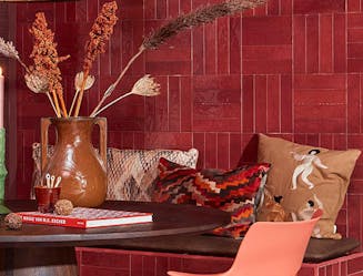 Geglazuurde rode wandtegels tegels, donker mangohout, recycled kunststof en saffraan kleurig metaal: de compacte eethoek is een bonte verzameling van vormen en materialen. De ronde eettafel is het centrale middelpunt en verbindt alle spectaculaire rood- en oranjetinten met elkaar. De XXL tegelwand van Sani Luxury loopt door in de betegelde eetkamerbank met stoer leren zitkussen.