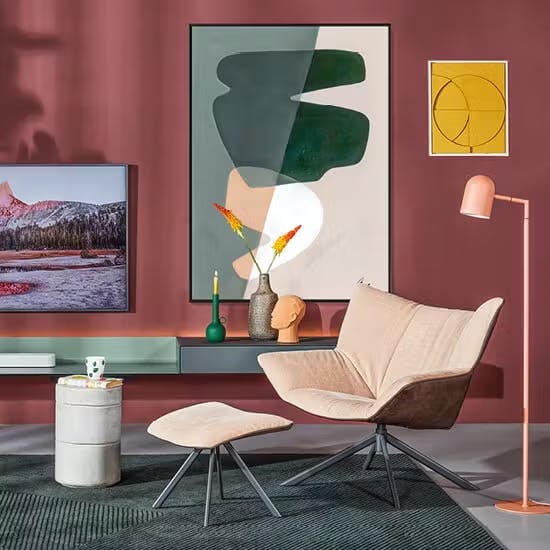 Voor een ultieme thuisbioscoop ervaring zorgt de slimme Spectral tv-oplossing, in grijsgroene kleur exclusief bij Eijerkamp, zonder zichtbare draden en met ingebouwde Sonos boxen en Samsung tv in de speelse zithoek. Fijn om naar te kijken én naar te luisteren is het grote abstracte kunstwerk van Werk aan de muur dat harde geluiden dempt.