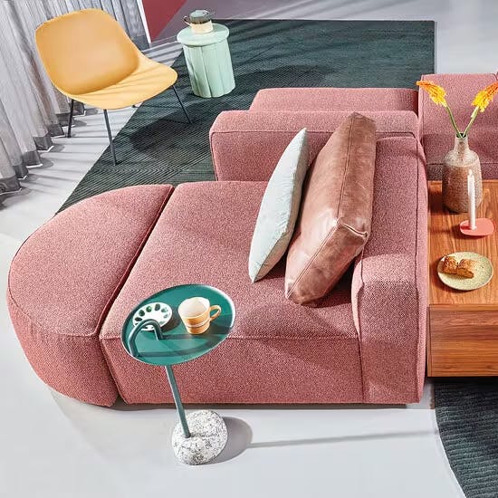 Op twee diepgroene karpetten staat de elementenbank in warmroze stof slim opgesteld zodat je aan alle kanten kunt zitten: voor de televisie, in de rustige leeshoek en in verbinding met de eethoek en de keuken. Maar wil je wat anders, dan verander je met de losse elementen, handige bijzetters en stoere leren poefs ook zo van opstelling. De ronde elementen zorgen voor een dosis extra fun in je eigen kleurrijke interieur!