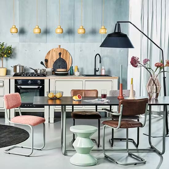 Ook de keuken in dit interieur is slim - en modulair - en stel je zelf samen uit diverse kookelementen welke je ook eenvoudig meeverhuist naar je volgende woning! In combinatie met de stoere, slanke maar oersterke eetset (handgemaakt in Sneek met een low footprint) ontstaat er een speelse materialenmix van staal, leer, teddy en hout. Stel je eigen eetset - in een kleurrijk jasje - samen uit een verfrissende selectie framekleuren, trendy stof- en leersoorten en houten bladen in gebeitste kleuren die allemaal lekker bij elkaar passen.