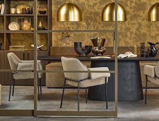 Met de schuifwand van Gewoon Gers in bronskleurig aluminium worden de zithoek en de eetkamer in woonstijl Golden Getaway als in een klassieke kamer en-suite van elkaar gescheiden. Zo zijn in de grote leefruimte twee aparte kamers gecreëerd die door de transparantie van de glaswand toch met elkaar in connectie staan. Dankzij het schuifmechanisme hoef je geen ruimte vrij te houden voor openslaande deuren, daarmee is deze transparante roomdivider ook geschikt voor de compactere woonruimte.