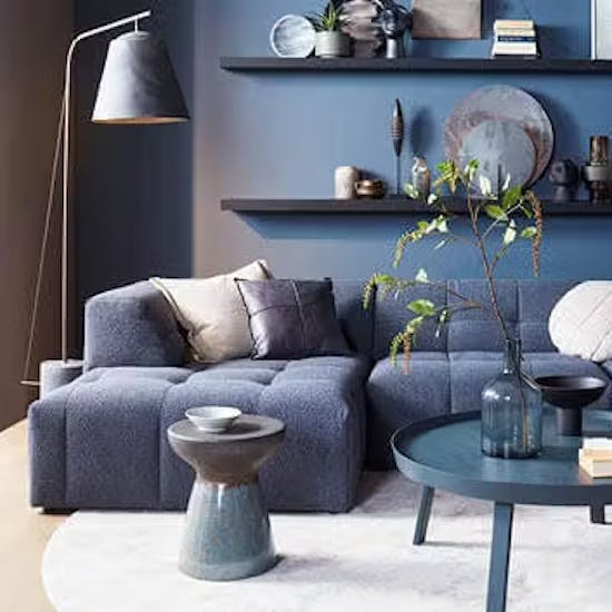 Blauw op blauw op blauw: van een blauwe bank tot een blauw vloerkleed en een blauwe salontafel. Haal de trendkleur indigo loft in huis en creëer je eigen indigo loft! Accenten in modderkleuren en een toefje zwart zorgen voor spanning in het verder indigo blauwe kleurenpalet. En dit blauwe interieur gaat pas echt leven in jouw woonkamer door te spelen met uiteenlopende materialen! Zo zien we in het zitgedeelte een mix van stoere materialen als grove bouclé, keramiek, wol, suède, beton gerecycled kunststof en zwart hout.