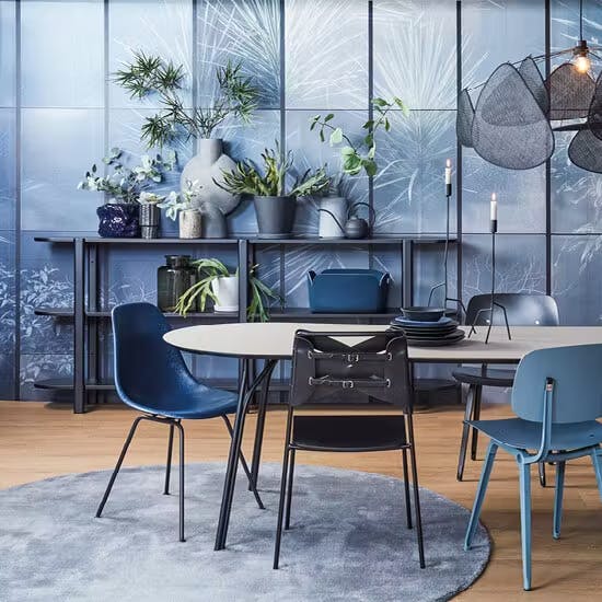 Geen wand is onbenut gelaten in deze stoere blauwe loft. Boven de bank presenteren twee XXL zwart eiken wandplanken een spannend stilleven van keramiek, kunst en fijne accessoires in een industrieel jasje. Achter de slanke eetset - in een niet alledaagse materialen mix van Fenix, geschuurd leer, gerecycled kunststof en fiberglass - zorgt de XXL behangprint voor verbinding met buiten. Met de roomdivider in glad zwart hout en gevuld met stoere grijsgroene planten, halen we de natuur naar binnen! En in je eigen art wall met kunststukken verstop je stijlvol je tv in je blauwe interieur.