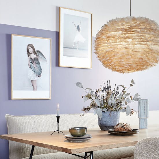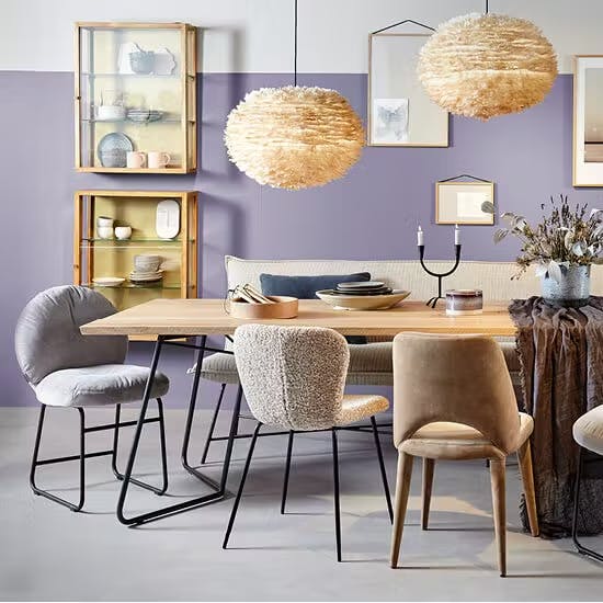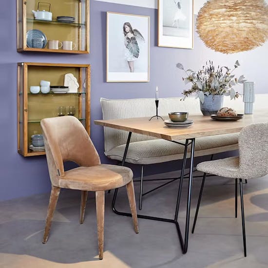 (Dag)droom weg in een romantisch interieur op de royale hoekbank in verwassen linnenlook met zachte kussens en subtiel afgeronde hoeken. Of nestel je in de ronde loveseat in zacht velvet met een rauw randje, lees rustig een boekje in de lichtgrijze schommelfauteuil of schuif aan bij het woongedeelte op de poef in blauwgrijs mat velours welke lijkt te bestaan uit twee ronde kussens. Op het ronde karpet ontstaat door de bijzettafels in beige keramiek en ragfijn goudkleurig metaal een nonchalante look. De grote eettafel in massief eiken met zwart onderstel van metaal en XXL eetbank nodigt uit tot lekker lang tafelen. De mix van stoelen in muisgrijs velours, aaibare teddy stof en goudkleurig velvet creëren de ‘uit de losse pols’- dynamiek.