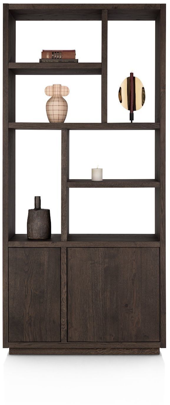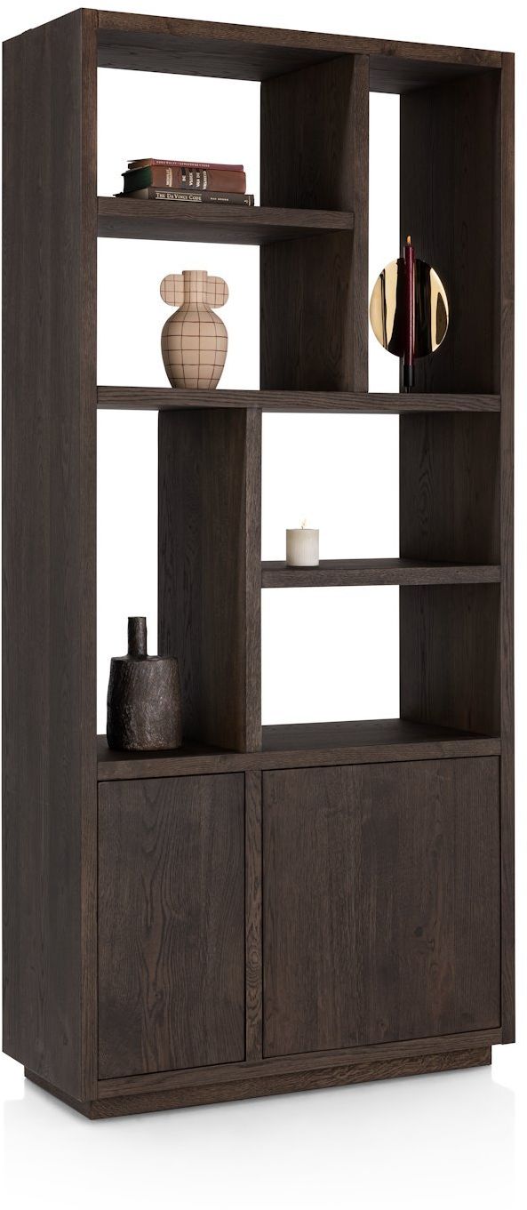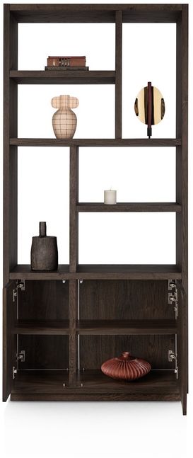 Roomdivider Gijon van Henders en Hazel is een stijlvol meubel dat ruimte en functionaliteit op een elegante manier samenbrengt. De asymmetrische indeling en de diepe eikenhouten tint geven de kast een eigentijdse uitstraling die goed past binnen diverse interieurstijlen. De roomdivider is voorzien van zes open vakken en twee deuren, waardoor je eenvoudig kunt variëren tussen presenteren en opbergen. Gebruik de open vakken voor decoratieve items en houd andere spullen netjes uit het zicht achter de deuren. Gijon is daarmee een praktische oplossing om ruimtes subtiel van elkaar te scheiden.