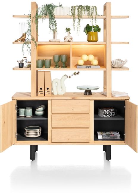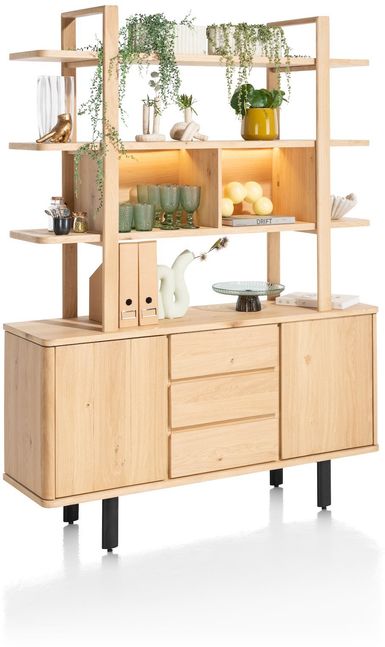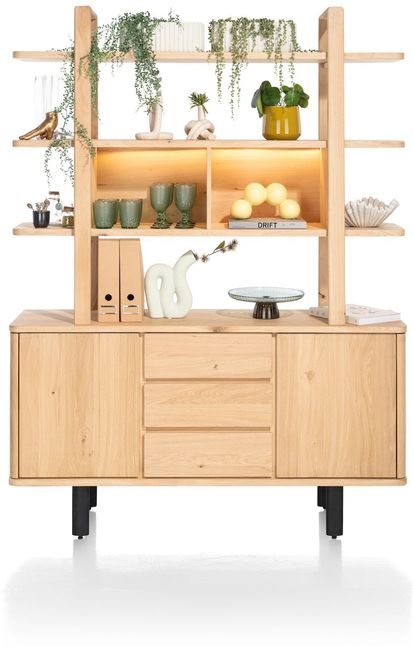 Buffetkast Homestead van Henders & Hazel is een echte blikvanger in huis! Deze handige kast biedt genoeg ruimte om diverse items zowel in als uit het zicht op te bergen. De strakke lijnen in combinatie met het landelijke uiterlijk maken deze buffetkast een stijlvolle toevoeging aan je interieur. Homestead heeft twee deurtjes en drie lades en is uitgerust met ledverlichting. De kast heeft diverse opbergvakken en wordt gemaakt uit een combinatie van eikenfineer en metaal.