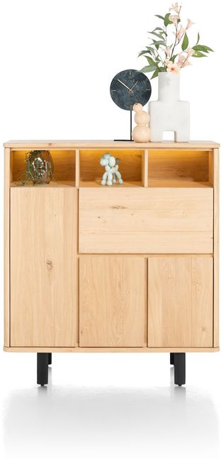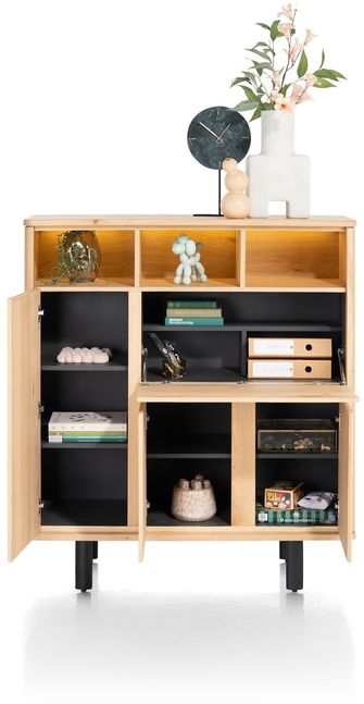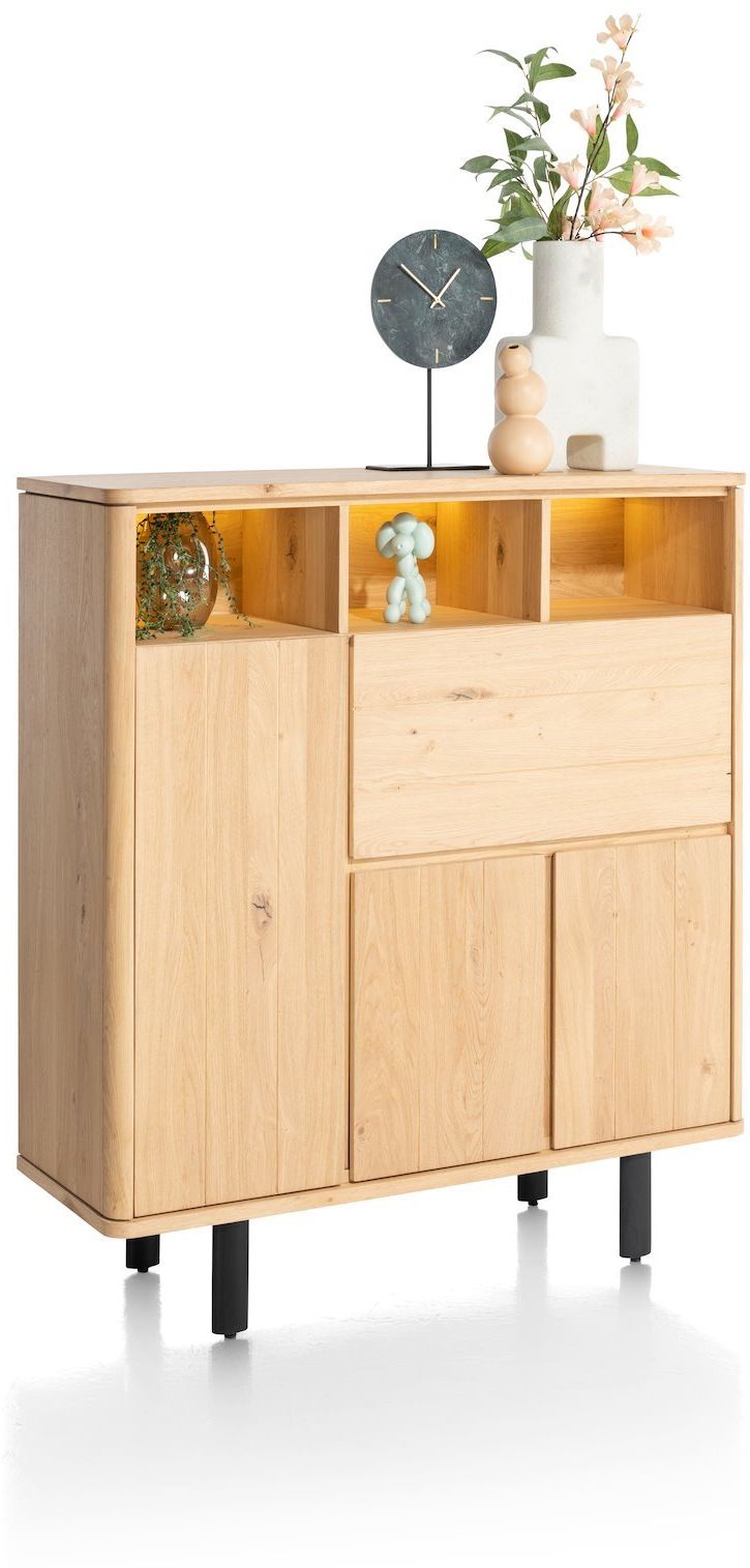 Highboard Homestead van Henders & Hazel biedt voldoende ruimte om diverse spullen in op te bergen. Deze landelijke kast is vervaardigd uit naturel kleurig eikenfineer en wordt ondersteund door zwart metalen pootjes. Homestead heeft drie deurtjes, een klep en is uitgerust met ledverlichting. Presenteer je favoriete woon items in de niches of op de kast en creëer een echte blikvanger in huis!