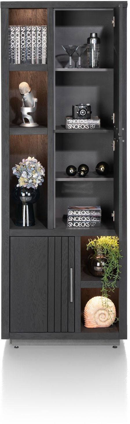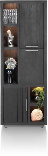 Pavie opbergkast van Henders & Hazel is ideaal om spullen op te bergen en je favoriete woonaccessoires een pronkplek in te geven! Je bergt spullen gemakkelijk uit het zicht op achter de drie deuren. Daarnaast heeft de kast maar liefst vijf open niches met sfeervolle LED verlichting. Zo Krijgen je woonaccessoires letterlijk en figuurlijk een plekje in de schijnwerpers. De opbergkast is vervaardigd uit zwart eiken en is naast getoond model ook verkrijgbaar in een groter formaat. Combineer de opbergkast met de andere meubels uit de Pavie serie voor een stijlvol geheel!