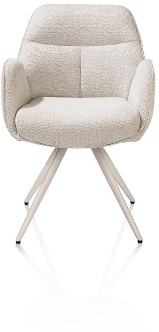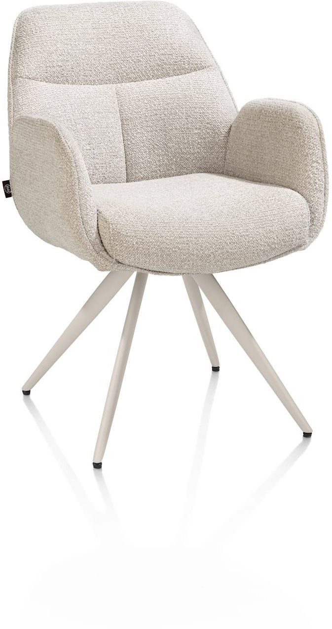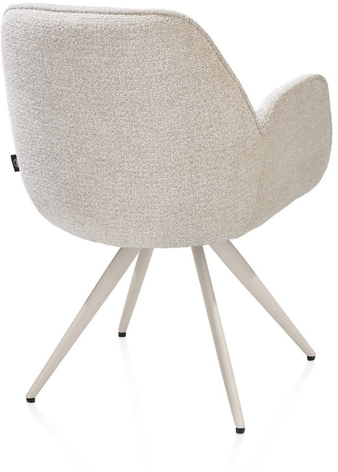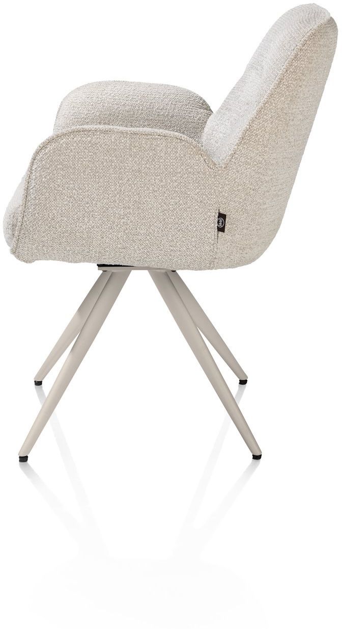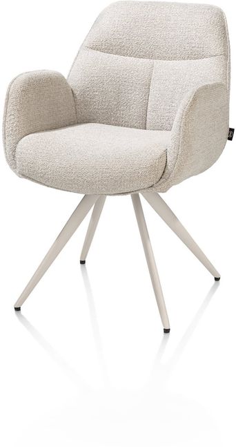 Armstoel Pippa van Henders en Hazel brengt comfort en stijl samen aan een moderne eettafel. Stoel Pippa is vervaardigd uit een stijlvolle combi-stoffering van verschillende beigetinten, waaruit het zitvlak is bekleed met de zachte Sevilla stof en de buitenvlak met microleder Oregon voor een kenmerkend contrast. Het zitgedeelte wordt gedragen door het ranke tijdloze onderstel, dat een praktische draaifunctie heeft om eenvoudig aan tafel te kunnen plaatsnemen! De Pippa stoel is ideaal voor lange diners of gezellige avonden, passend binnen uiteenlopende woonstijlen.
