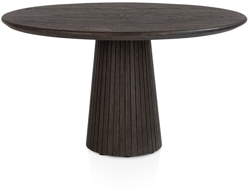 Breng vorm en functionaliteit samen met eettafel Ravello van Henders en Hazel. Deze ronde tafel heeft een diameter van 140 cm en is vervaardigd uit donker eikenfineer. Het centrale middenpootonderstel met verticale lijnen zorgt voor voldoende beenruimte rondom de tafel. Dankzij de ronde vorm is Ravello ideaal voor sociale momenten aan tafel. Combineer deze eettafel met andere meubels uit de Ravello-serie voor een samenhangend interieur.